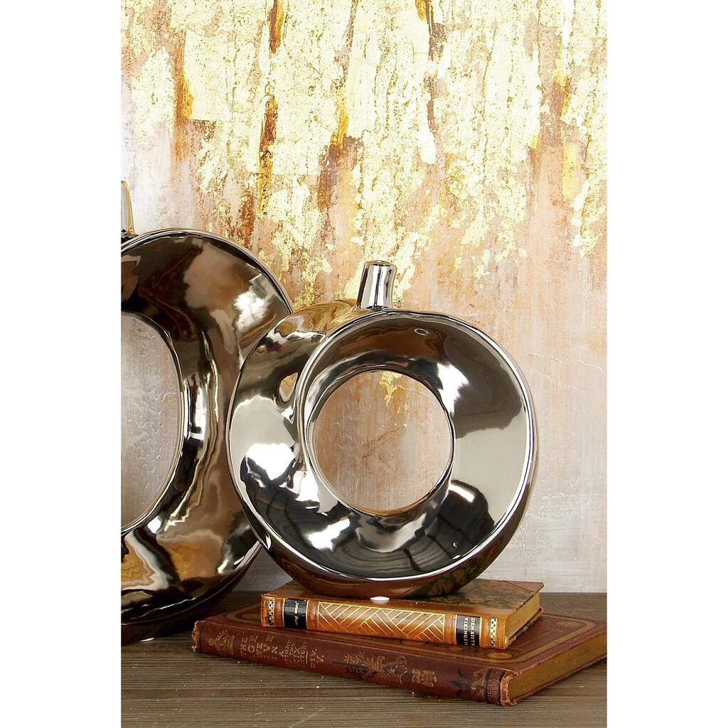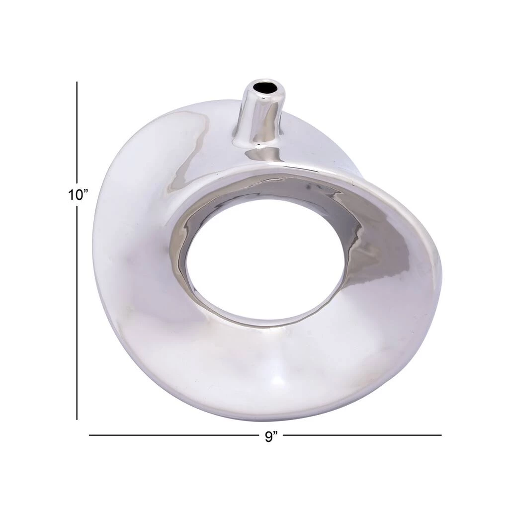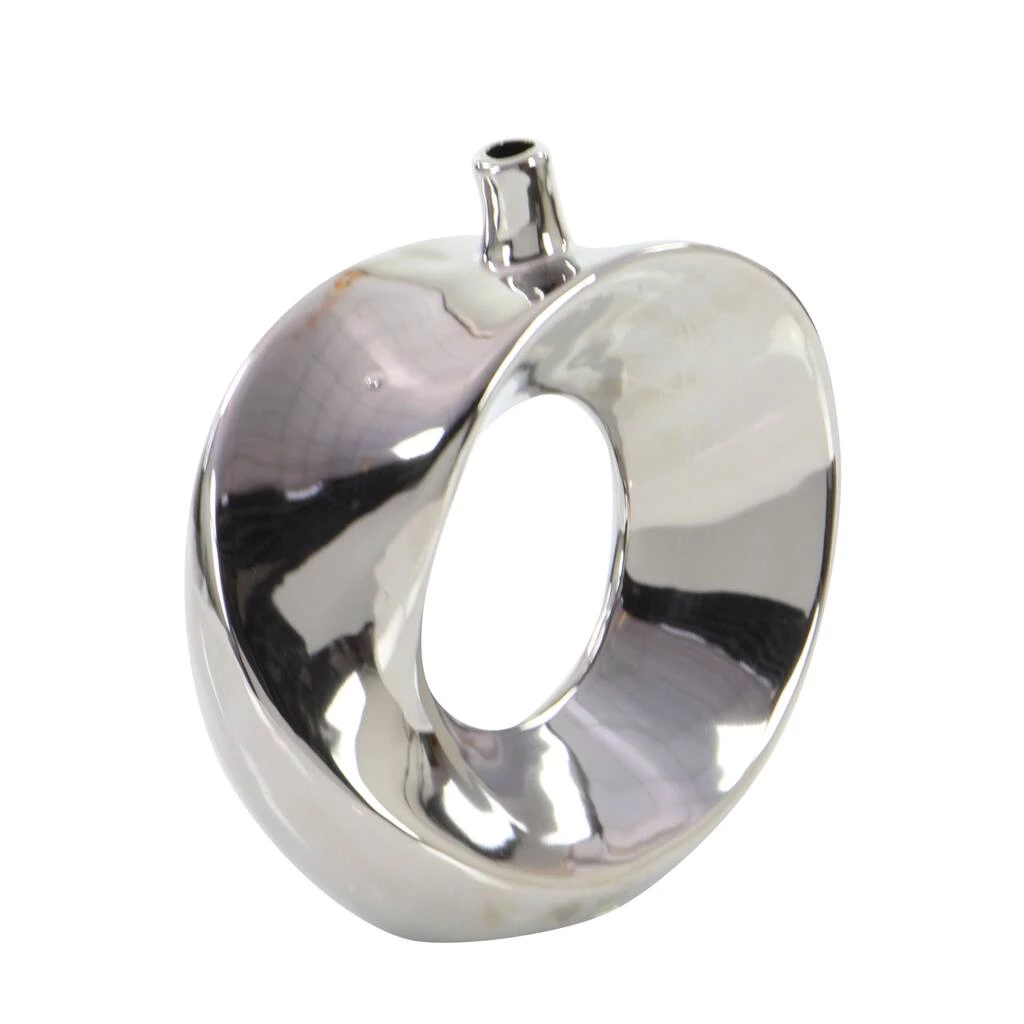 Get the bold look of mirrored glass with the delicate contours of ceramic in this decorative vase. A smooth, reflective coat of electroplated silver coats the O-shaped twist with a punched out center. The top of this silver vase has a tall, narrow neck, perfect for a single flower. Designed with black rubber stoppers at the base that prevent scratching furniture and table tops, as well as sliding around.