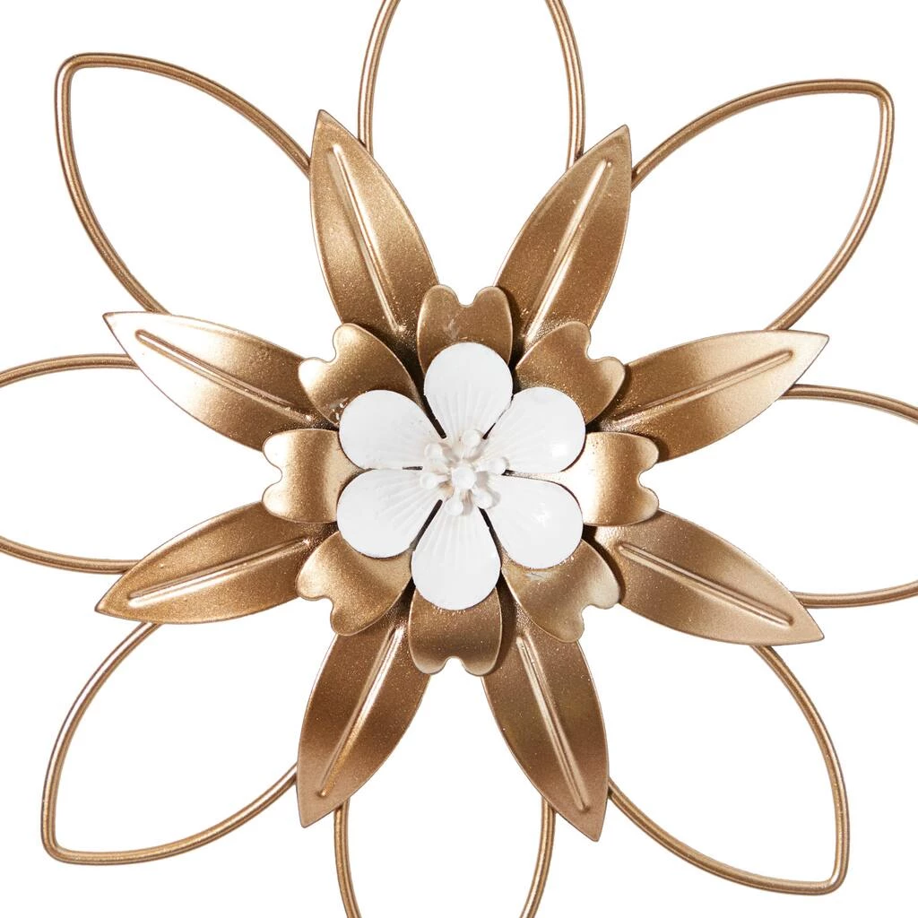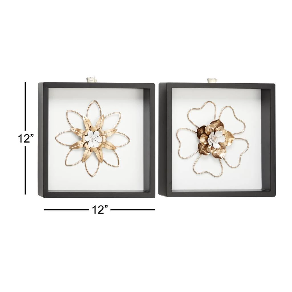 You can never go wrong with gilded 3D wall art to add dimension and eye-catching style in your space. This set of 2 gold metal flower wall dΓ©cor pieces feature metallic iron flower sculptures layered to create a shadow box effect with white flower centerpieces. Each floral wall art sculpture boasts a unique metal flower design against a solid white back and square black frame to unify the set. This gold wall art set is bold yet versatile in style, complementing contemporary, modern, and boho style rooms.
