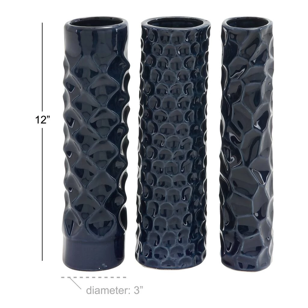 Embrace the dark side with this 12″ Dark Blue Stoneware Contemporary Vase Set made of pure stoneware. This 3-piece set will further pull you away from the light with these tall round cylinder structures designed with raised organic diamond pattern. The vases also feature a smooth rim base, small honeycomb pattern, and geometric leaves pattern on its narrow cylinder form. These ceramic vases are perfect for any contemporary set up that likes to stick with dark colors or heavy contrast.