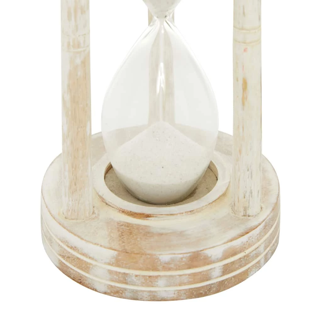 Need a smart and stylish way to keep track of time? A sand-filled hourglass could be the solution. This timer features a rounded wood frame with a distressed white finish. A sand-filled glass chamber sits in the middle of the frame. Invert the timer and watch the sand slowly trickle from the top of the chamber to the bottom. The timer can also serve as a dΓ©cor piece and will add to a country cottage aesthetic in your living room, bedroom or home office.