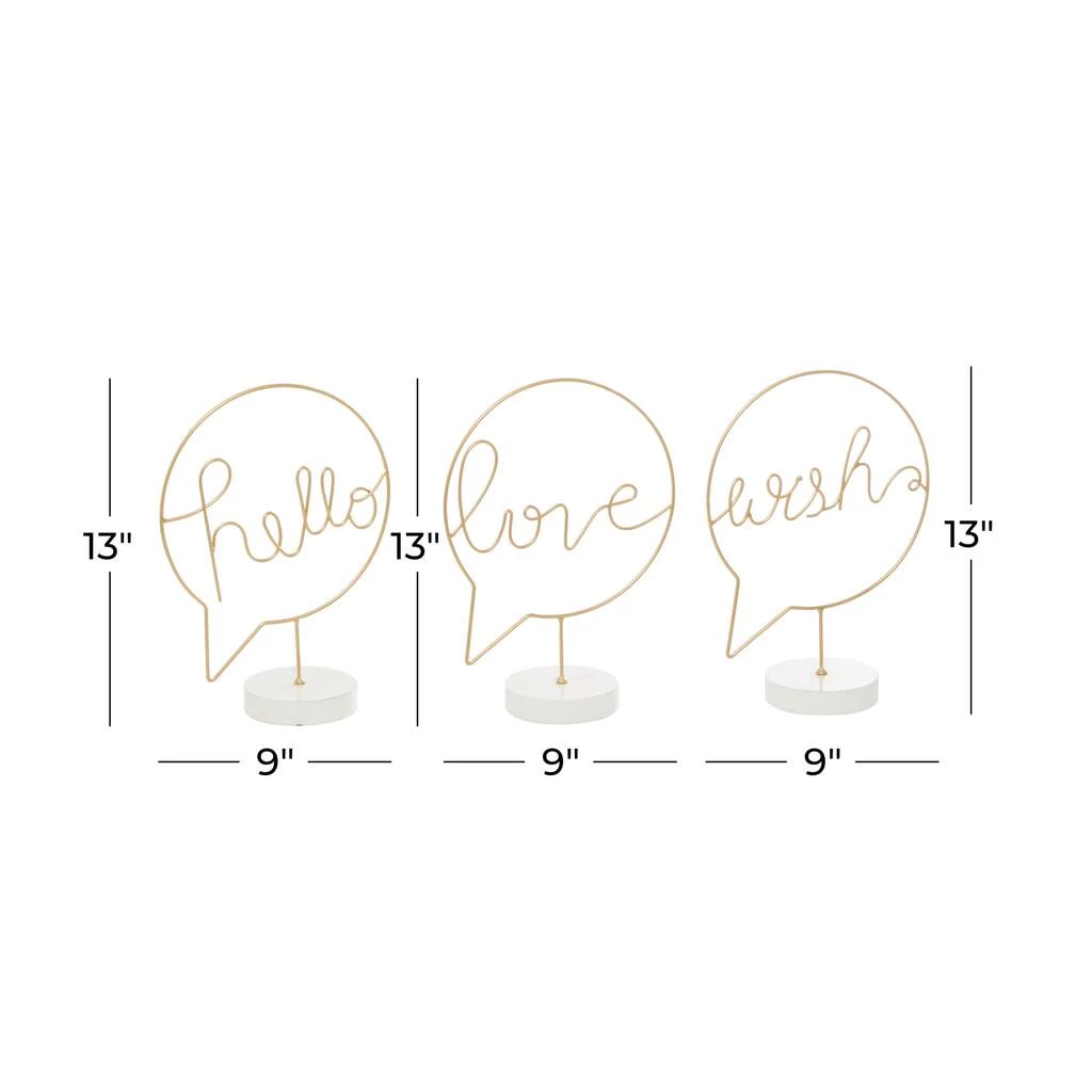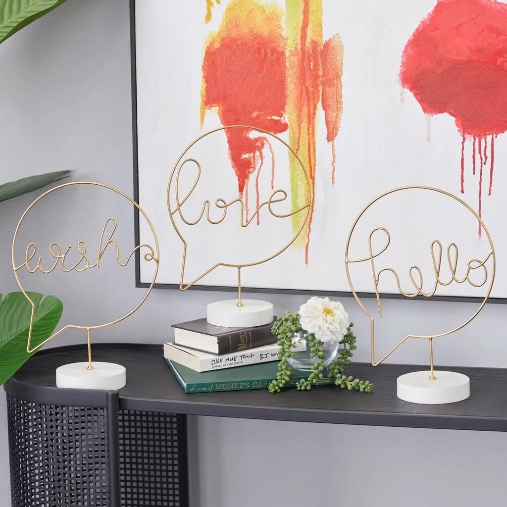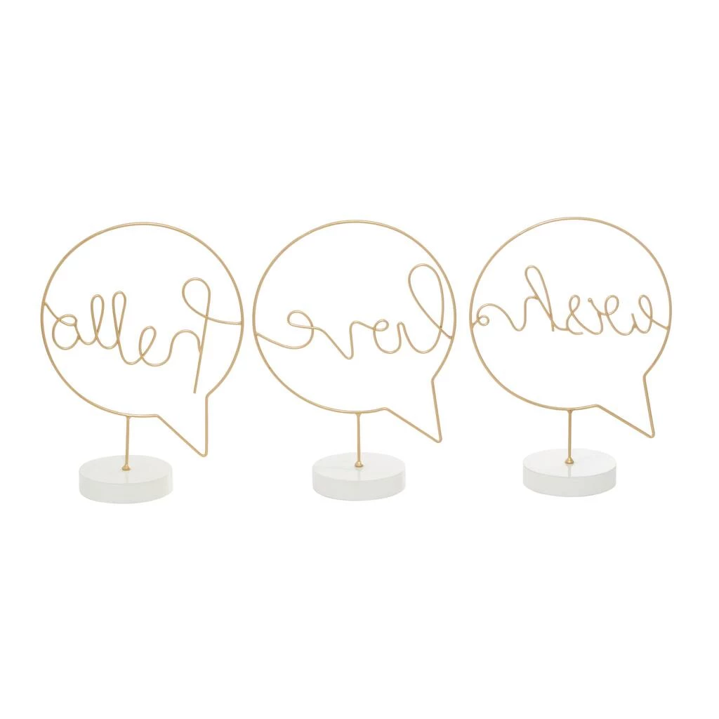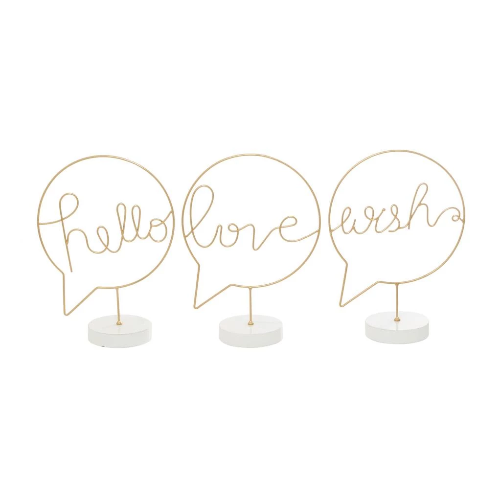 Amplify the ambiance of your space with this set of table décors. These pieces are designed to offer any contemporary themed home a final touch. This décor accent set is made out of wood and iron, hence it will remain in pristine condition for the years to come. With its remarkable characteristics, you can show off this incredible home décor set that features speech balloon tabletop décors with word designs, gold and white finishes, and thick round bases. Let these accent pieces provide a sense of style to your home atmosphere by displaying them on top of a shelf, countertop, mantel, or an accent table.