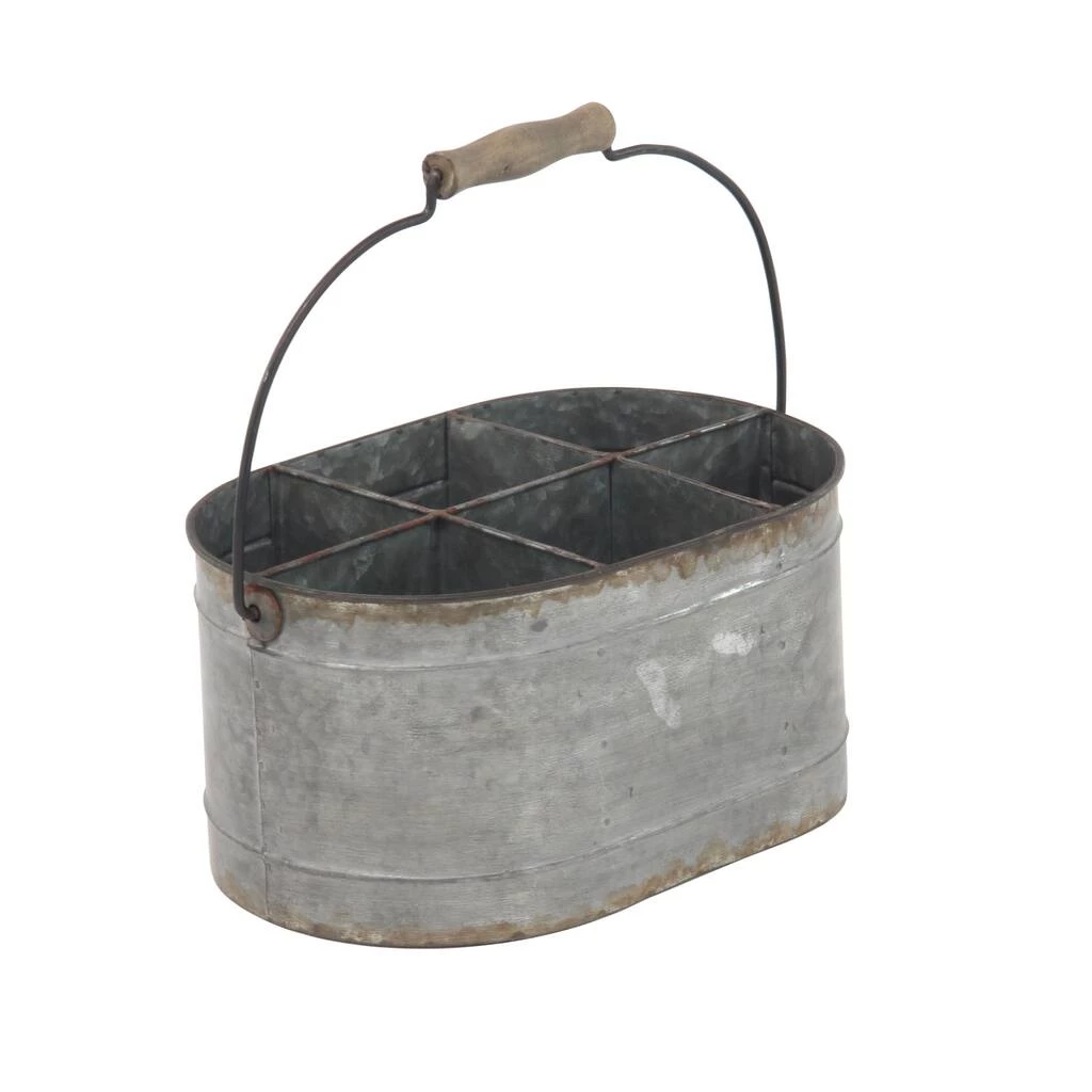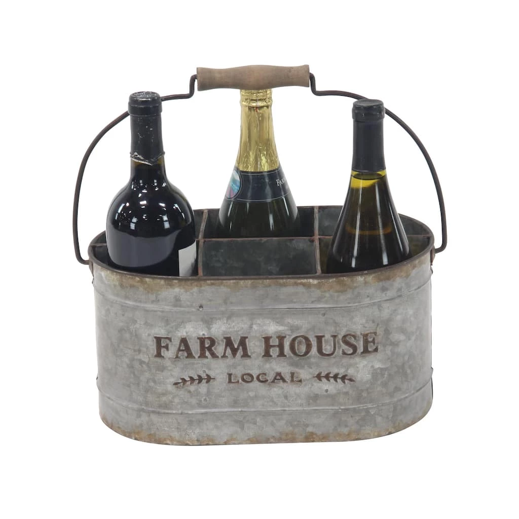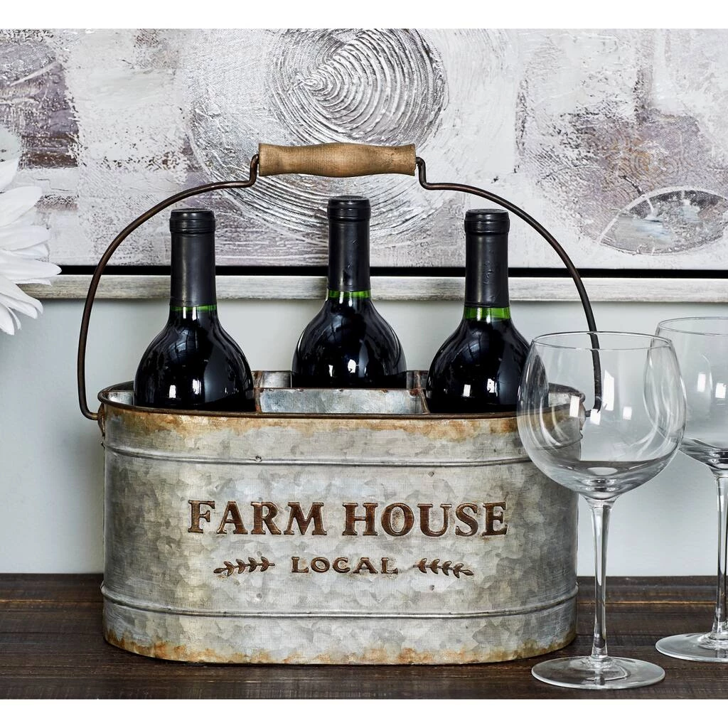 Enjoy the beauty and security of this farmhouse style gray metal wine bucket. Its metal material makes it the perfect vessel to hold and display your aged wine collection in your kitchen, dining room, or living room. The distressed rust and gray finish give this wine holder an antique appeal. Display this on any surface and see how it draws attention towards your wine collection. This item can sturdily hold 6 wine bottles. It features large lettering reading “Farm House Local”.