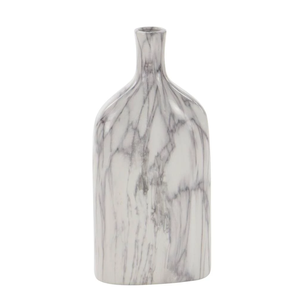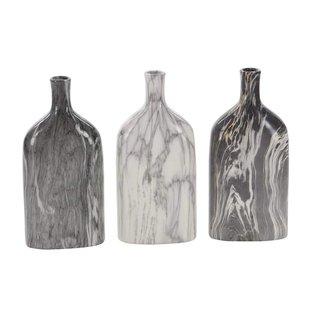 This set of 3 tall vases bring elegant movement with their animated marble finishes, smooth clean lines, and basic forms. The versatile black, white, and gray hues are the epitome of a fashionable contemporary color palette.