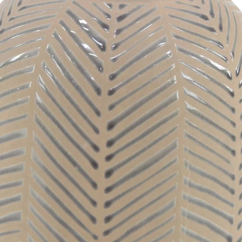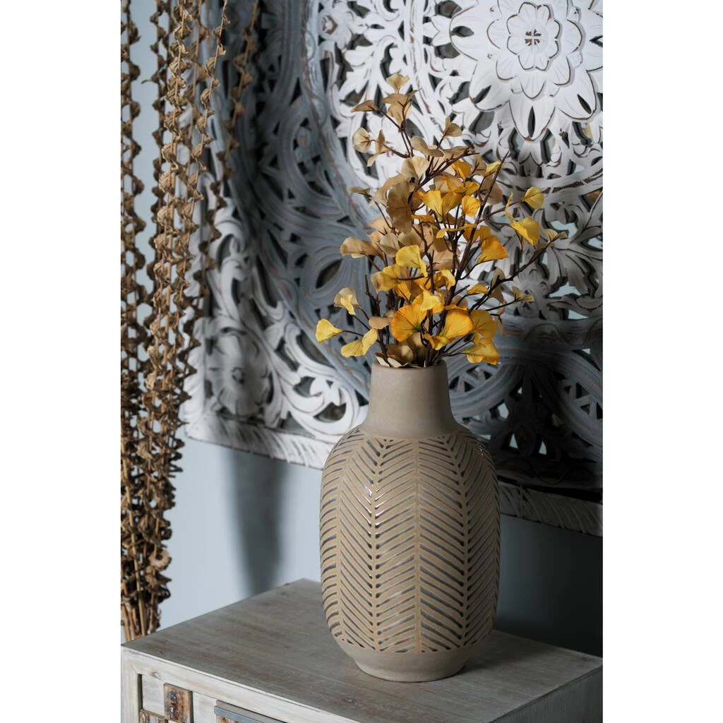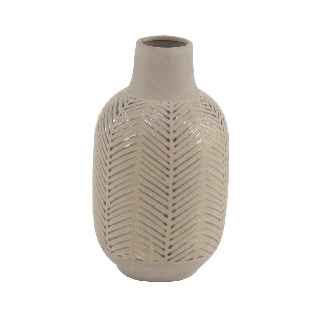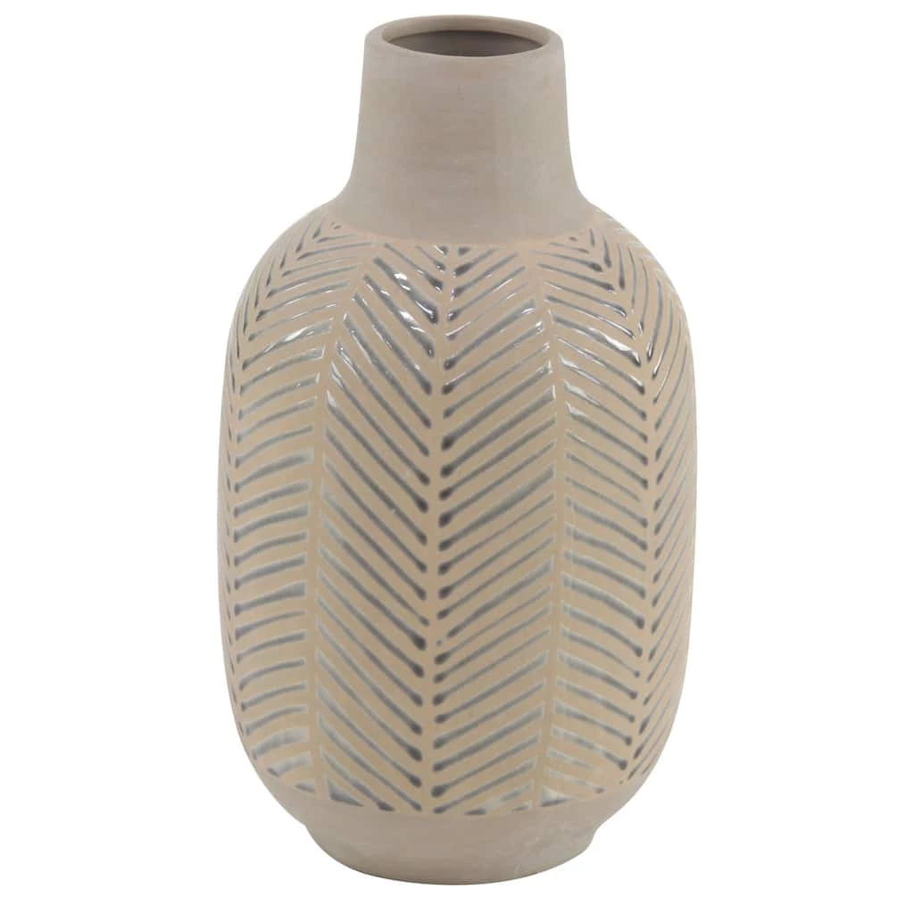 This light brown stoneware vase with silver leaf patterns creates an earthy vibe for your eclectic-themed home spaces. Made with stoneware, it is sculpted with a rounded body with a tapered neck and a flat base. This table vase highlights a light brown matte finish with embossed metallic silver leaf patterns. Display as a decorative or functional accent or centerpiece in your dining or living room, this stoneware vase is sure to add personality to your eclectic home style.