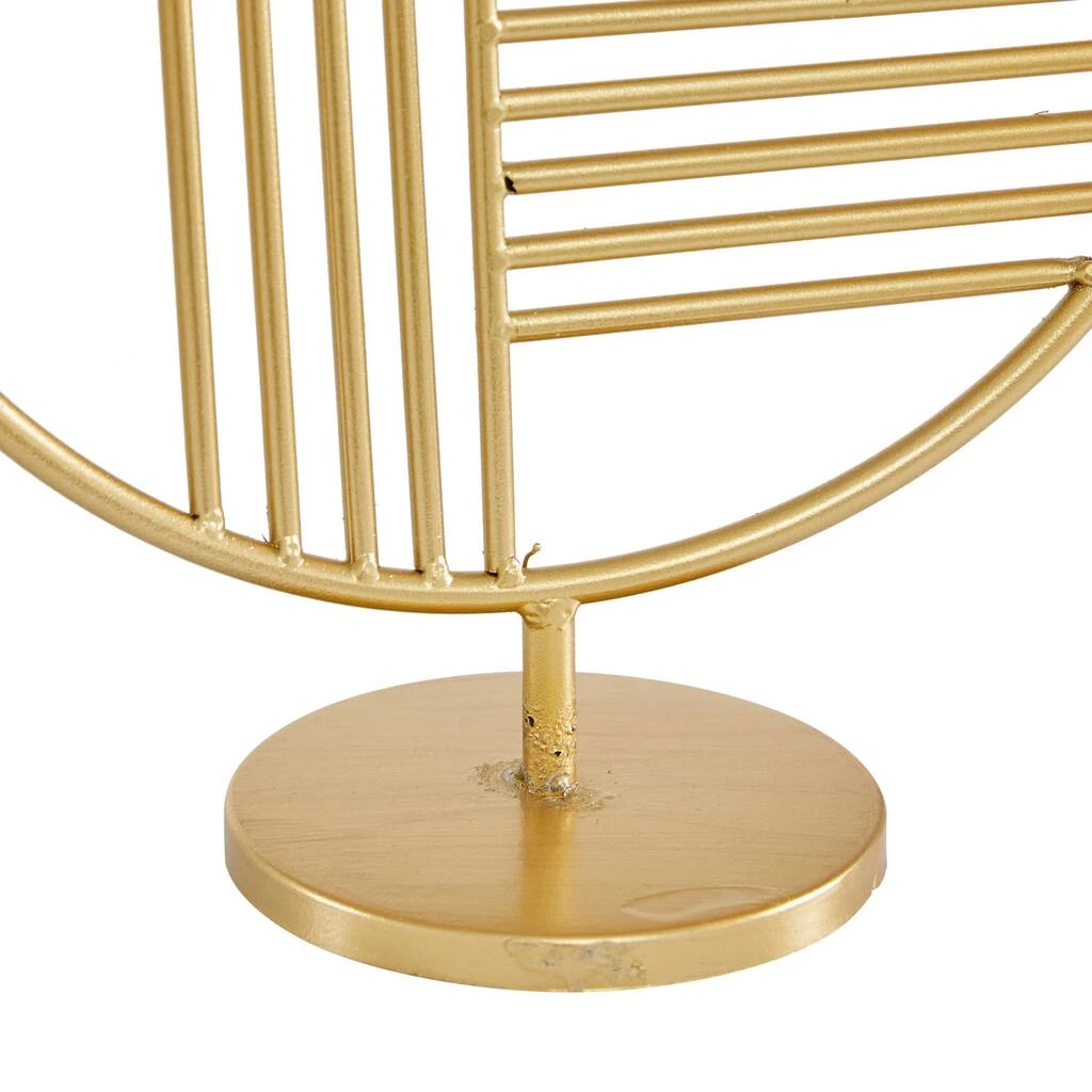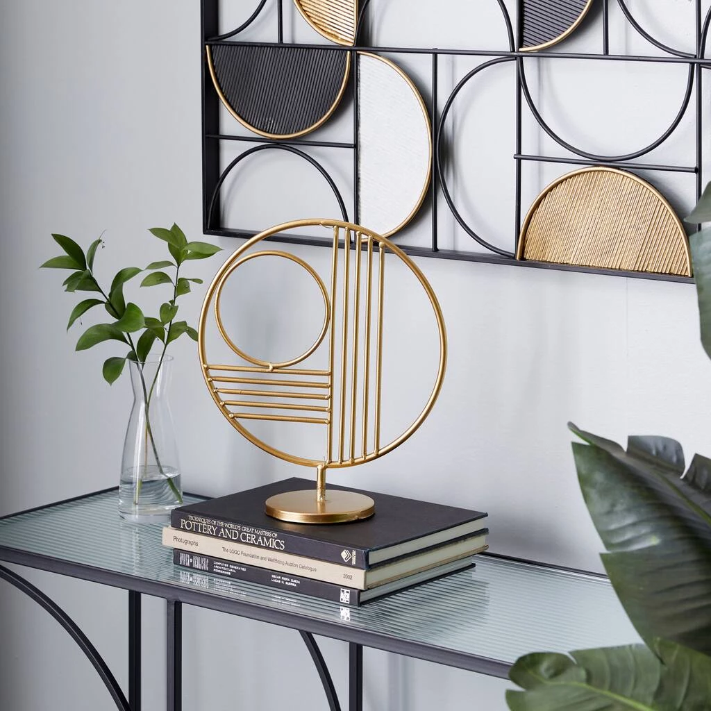 This unique accent dΓ©cor piece features modern geometric shapes encased in a large metal circle, creating an abstract modern design. The entire piece is finished in a powder-coated metallic gold for a highly reflective shine. The round base props this circular modern design up and is non-skid to protect your surfaces.
