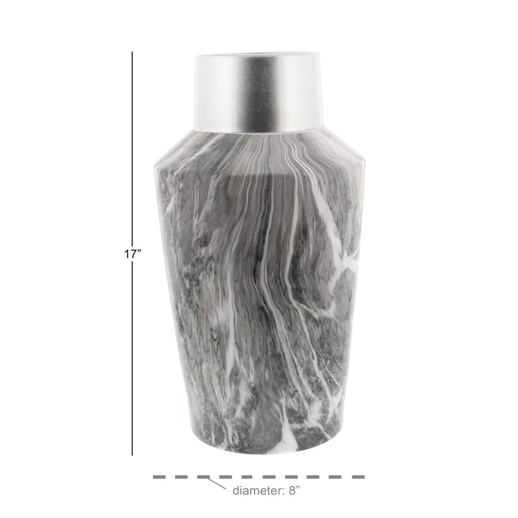 Add an unconventional touch of modern-inspired decoration into your contemporary, eclectic, and modern living spaces with this splendidly smooth gray and white marbled vase! This smoke-like vase decor showcases an urn-shaped vase designed with a white and gray marble-glazed body & a metallic silver-finished round cylindrical neck made of stoneware material. Its captivating grayish black tone makes it ideal for both light and dark-hued interiors/furniture, making it a stunning focal point piece for coffee tables, desks, dining areas, study rooms, meeting rooms, and home office. Designed with black rubber stoppers at the base that prevent scratching furniture and table tops, as well as sliding around.