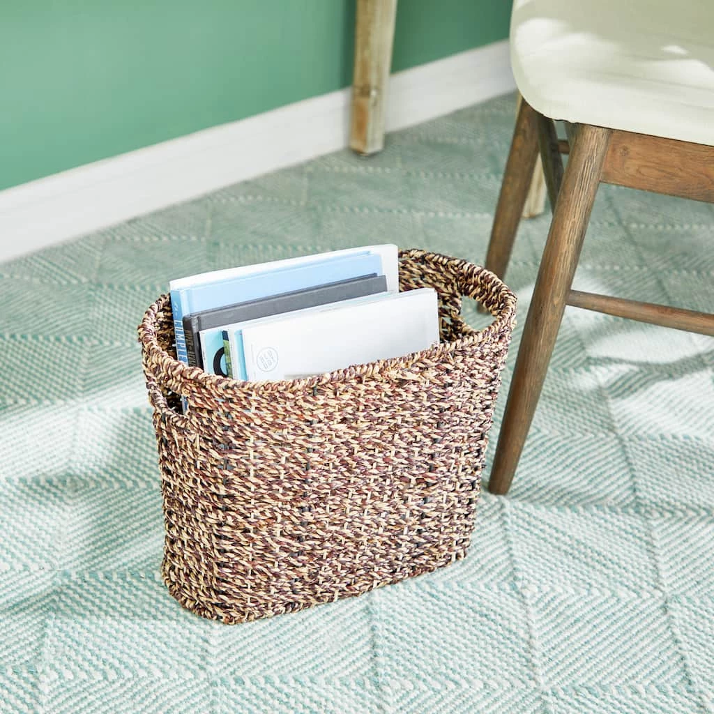 Bring coastal textures with natural hues to your space while keeping tidy… This natural brown magazine rack is handmade from eco-friendly seagrass gathered off the shores of Vietnam. The earthy light and dark brown colors create a speckled pattern throughout the magazine basket frame. Large rectangular cutouts on each side make for easy-grip handles.