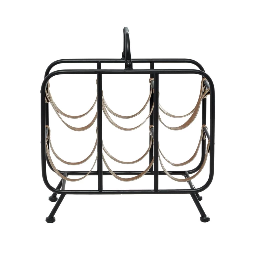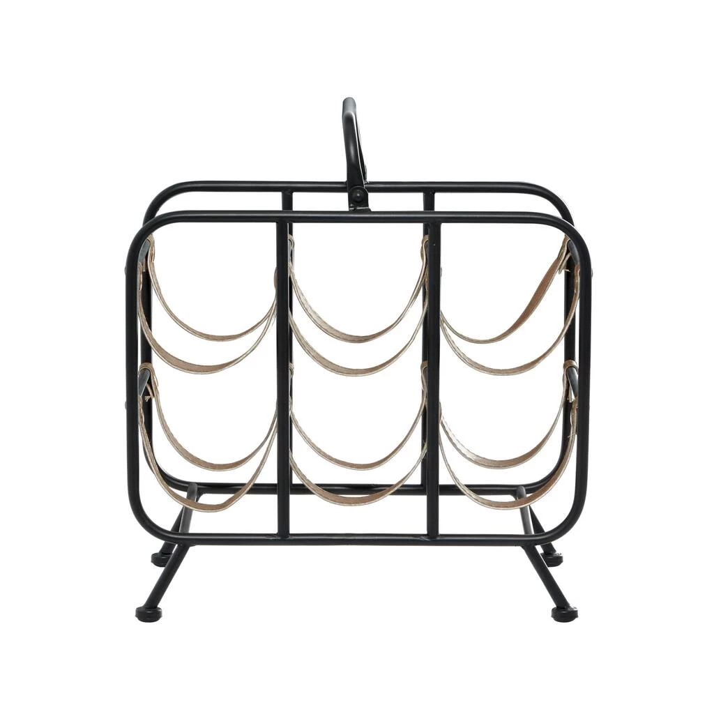 This metal and leather 6-bottle wine holder gives your industrial-themed home a blend of vintage and modern vibes. Made with a full metal frame, this wine holder flaunts 2 tiers of natural brown buttoned leather straps for its 6 wine bottle holders. Its metal frame conveniently extends to 4 flat base leg stands and a single tubular handle. Placed on your indoor or outdoor tables, this wine bottle holder is a convenient and chic addition to your industrial home spaces. Designed with black stoppers at the base that prevent scratching furniture and table tops, as well as sliding around.
