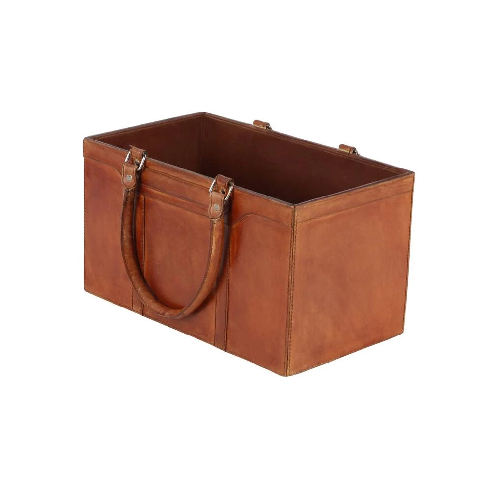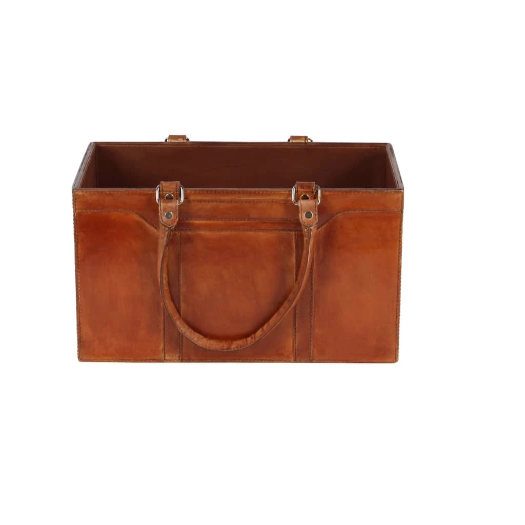 Organize your office or living room in style with this authentic brown leather magazine holder with leather handles. Use it as a stylish office organizer or display it in your living room to hold a throw blanket and books or magazines while adding a rich, warm brown leather texture. Handmade in India, this accent piece offers tidy organization and rustic style.