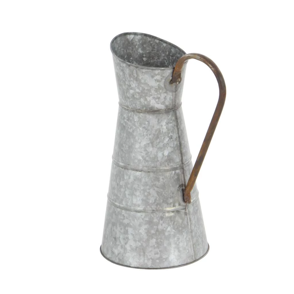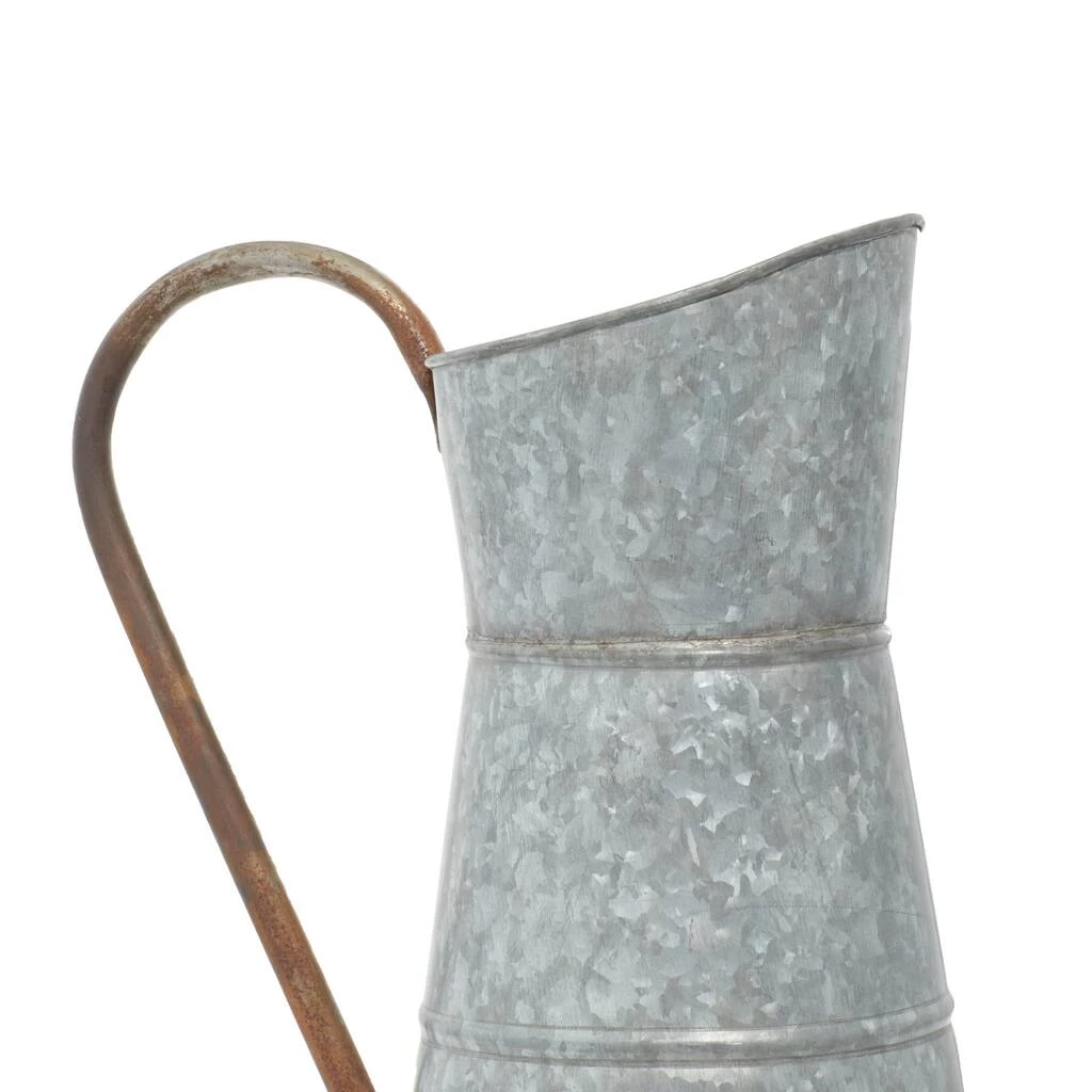 This decorative planter is sure to add charm to your home. Beautifully detailed, it features a distressed gray finish with brown highlights. It is designed with a flared top, curved handle, and banding details. This planter is made out of iron with solid construction, offering durability.