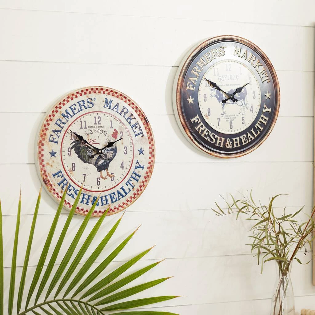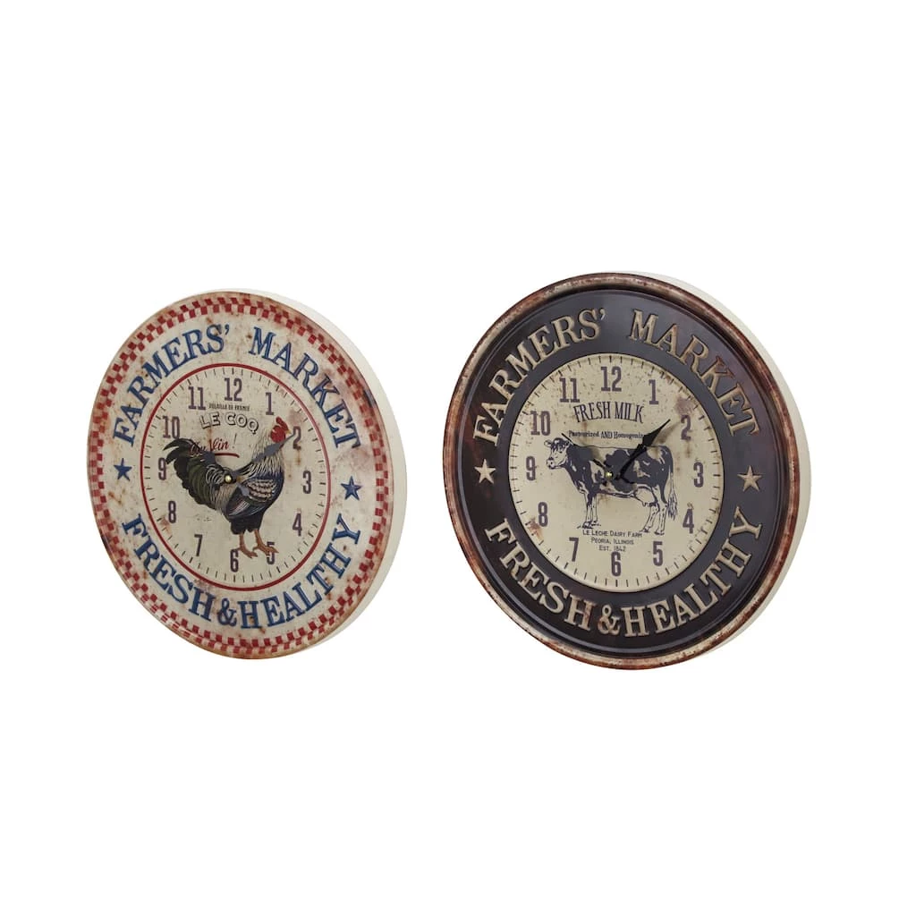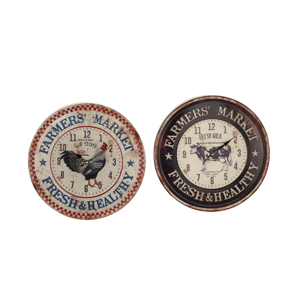 These farmhouse style inspired design 16″ Multicolored Metal Farmhouse Wall Clock Set will provide your home with unlimited easy farmhouse vibes when displayed on walls on two different homes for easy timekeeping wherever you go in the house. Tie your Vintage Farmhouse space together with this pair of antique style metal wall clocks, each featuring detailed illustrations and script. Items come with metal loops for easy and secure hang. Suitable for indoor use only. This set includes 2 wall clocks. Clock face reads “FARMER’S MARKET FRESH & HEALTHY” in blue lettering around the clock face. The cow clock has dark brown and white colors, also with “FARMER’S MARKET FRESH & HEALTHY” with stars around the clock face.Β