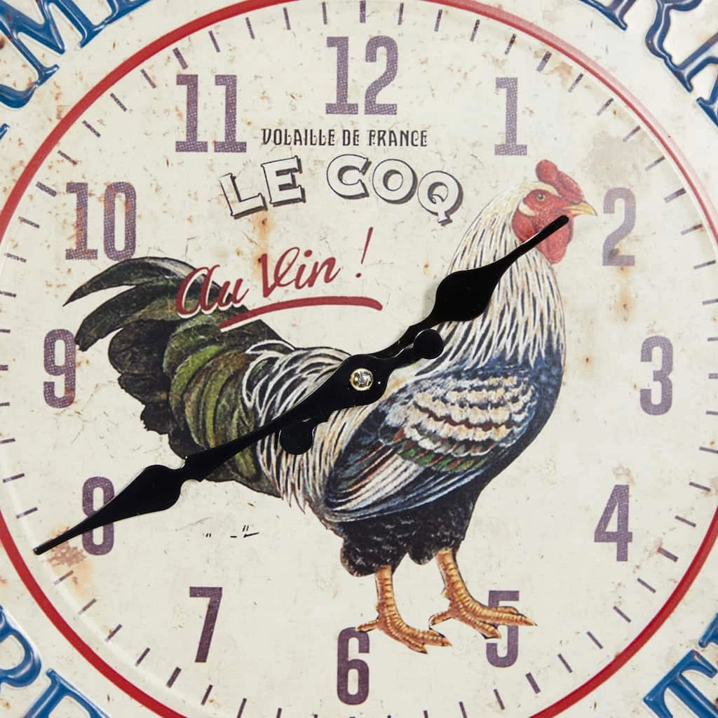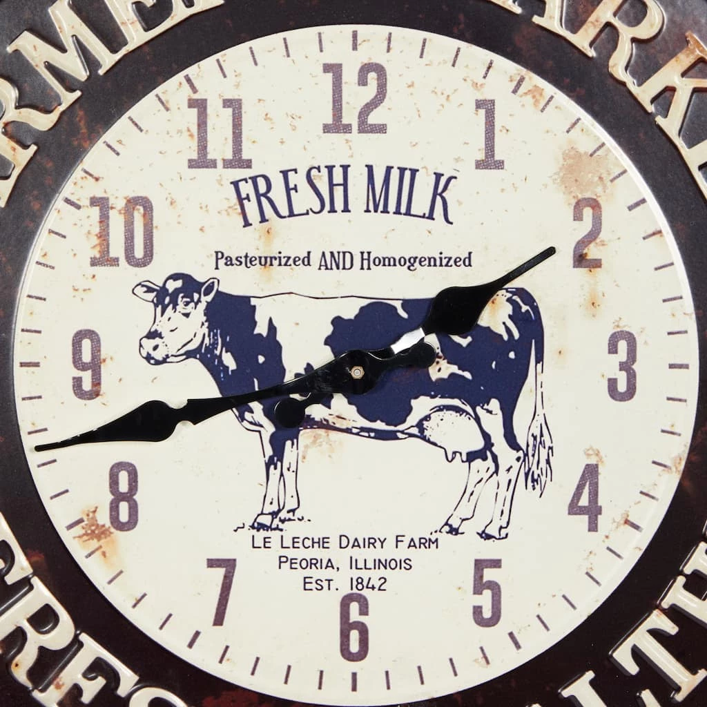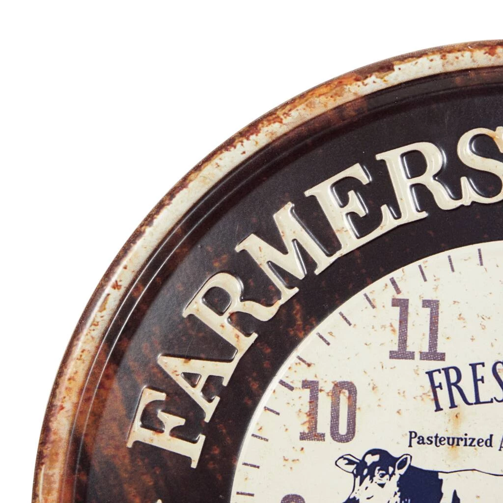 These farmhouse style inspired design 16″ Multicolored Metal Farmhouse Wall Clock Set will provide your home with unlimited easy farmhouse vibes when displayed on walls on two different homes for easy timekeeping wherever you go in the house. Tie your Vintage Farmhouse space together with this pair of antique style metal wall clocks, each featuring detailed illustrations and script. Items come with metal loops for easy and secure hang. Suitable for indoor use only. This set includes 2 wall clocks. Clock face reads “FARMER’S MARKET FRESH & HEALTHY” in blue lettering around the clock face. The cow clock has dark brown and white colors, also with “FARMER’S MARKET FRESH & HEALTHY” with stars around the clock face.Β