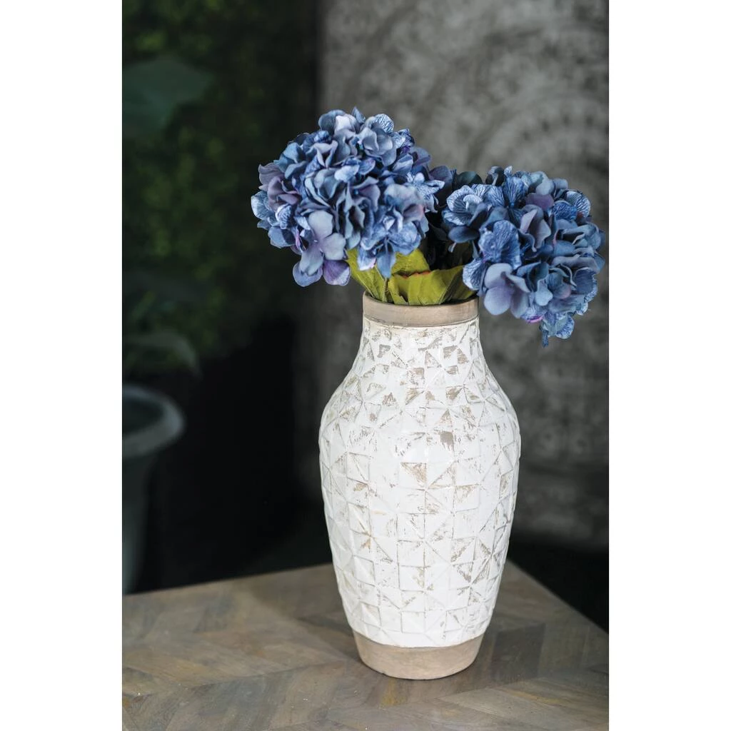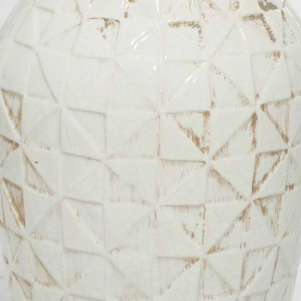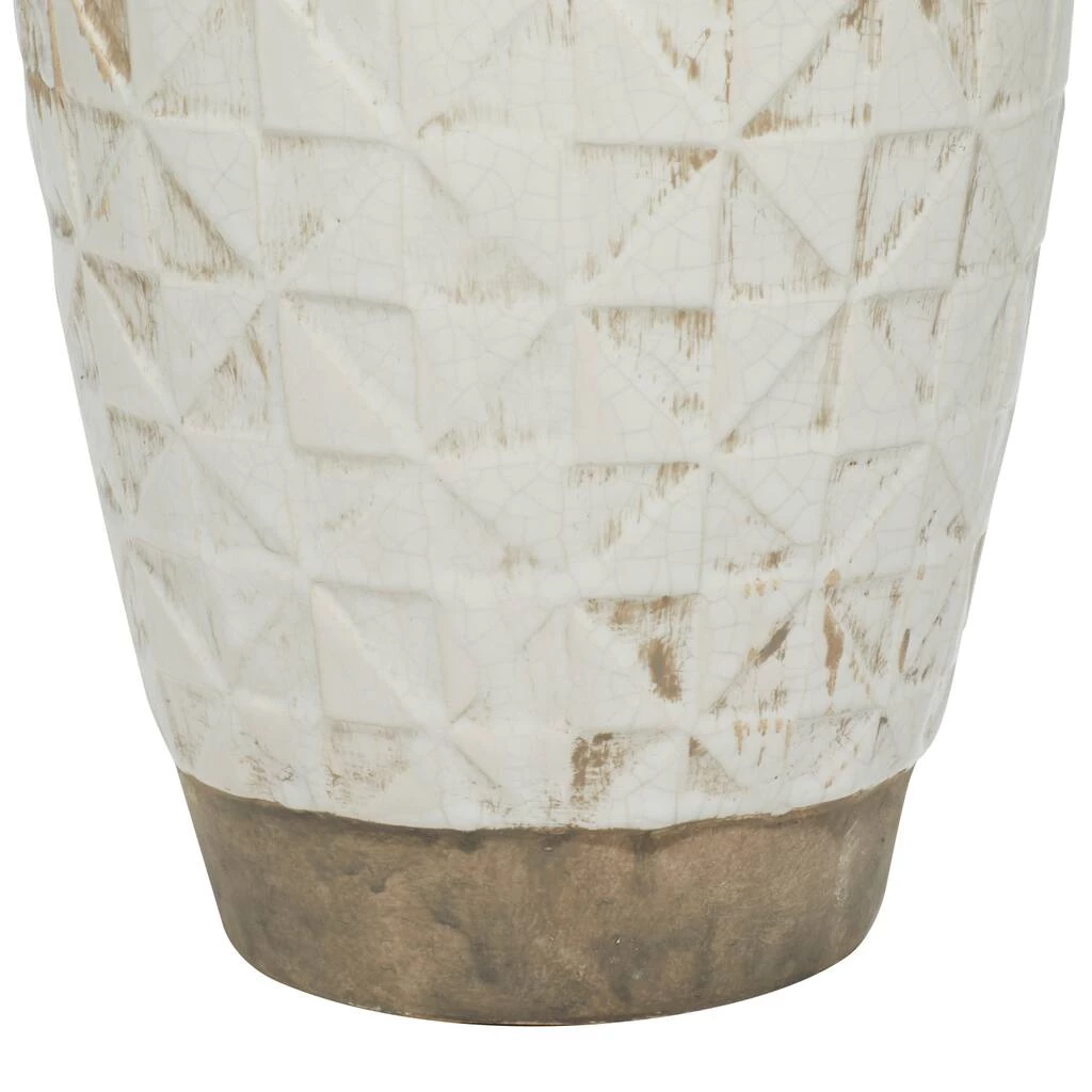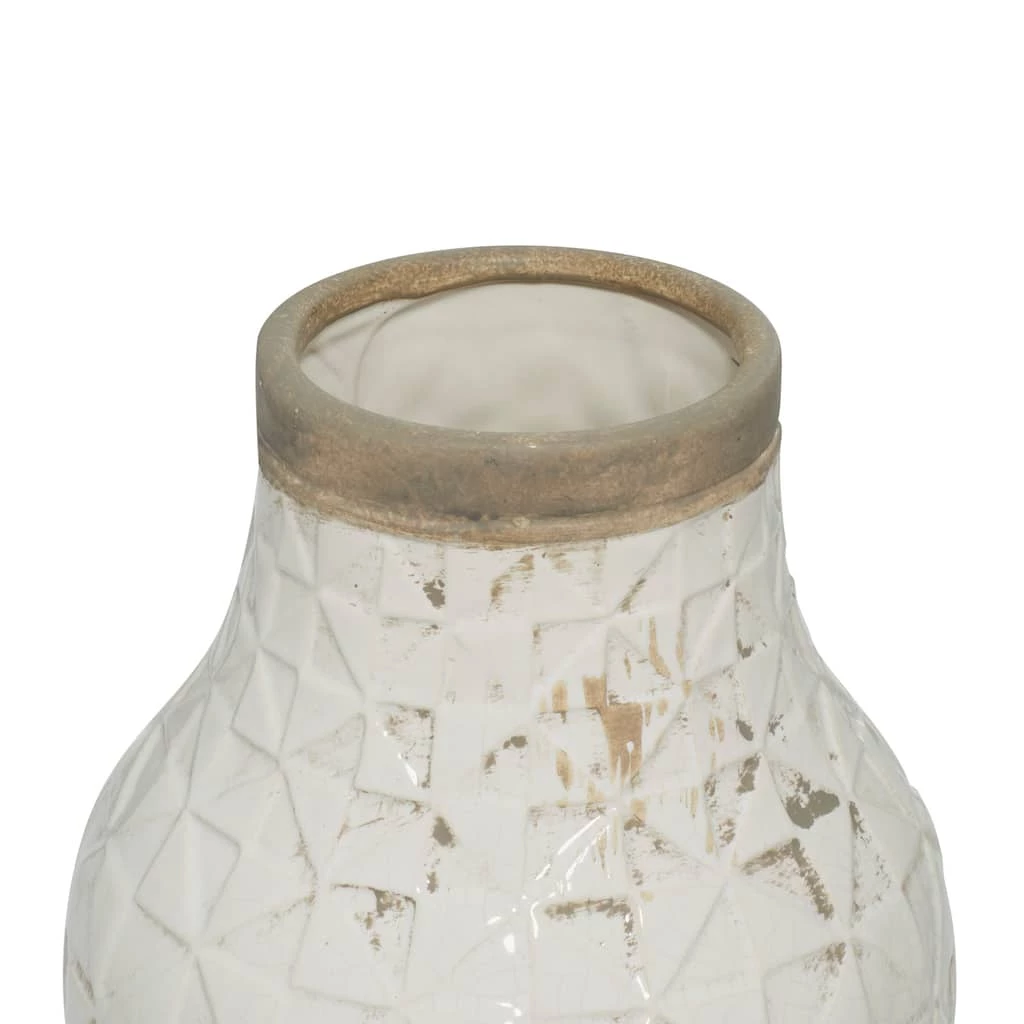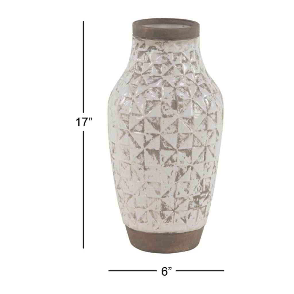 The timeless appeal of this 16″ White Stoneware Coastal Style Vase will go well in your coastal living space. It features geometric figures on its ceramic surface all in a distressed white finish. The finish makes the vase appear vintage and more elegant. The wide circular opening makes this vase ideal for holding your freshly picked flowers or for other decors that you might fancy. Place this on your side tables, accent tables or coffee tables to beautify your home. Suitable for indoor use only. This ceramic vase has a 4″ mouth opening. This item comes shipped in one carton.