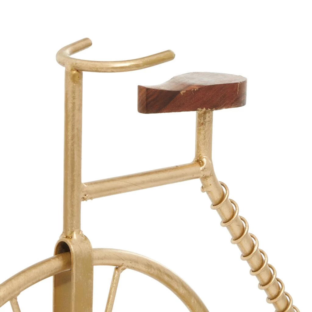 Whether your style palette is vintage-inspired or your just a cycle-lover, this metal bicycle table dΓ©cor brings whimsy and an antique essence to your space. The penny farthing bicycle sculpture is built from lightweight yet sturdy iron with a metallic gold finish and a swirling looped accent over the frame. The sculpture is adhered to a flat metal base with stoppers to prevent scuffs and sliding.
