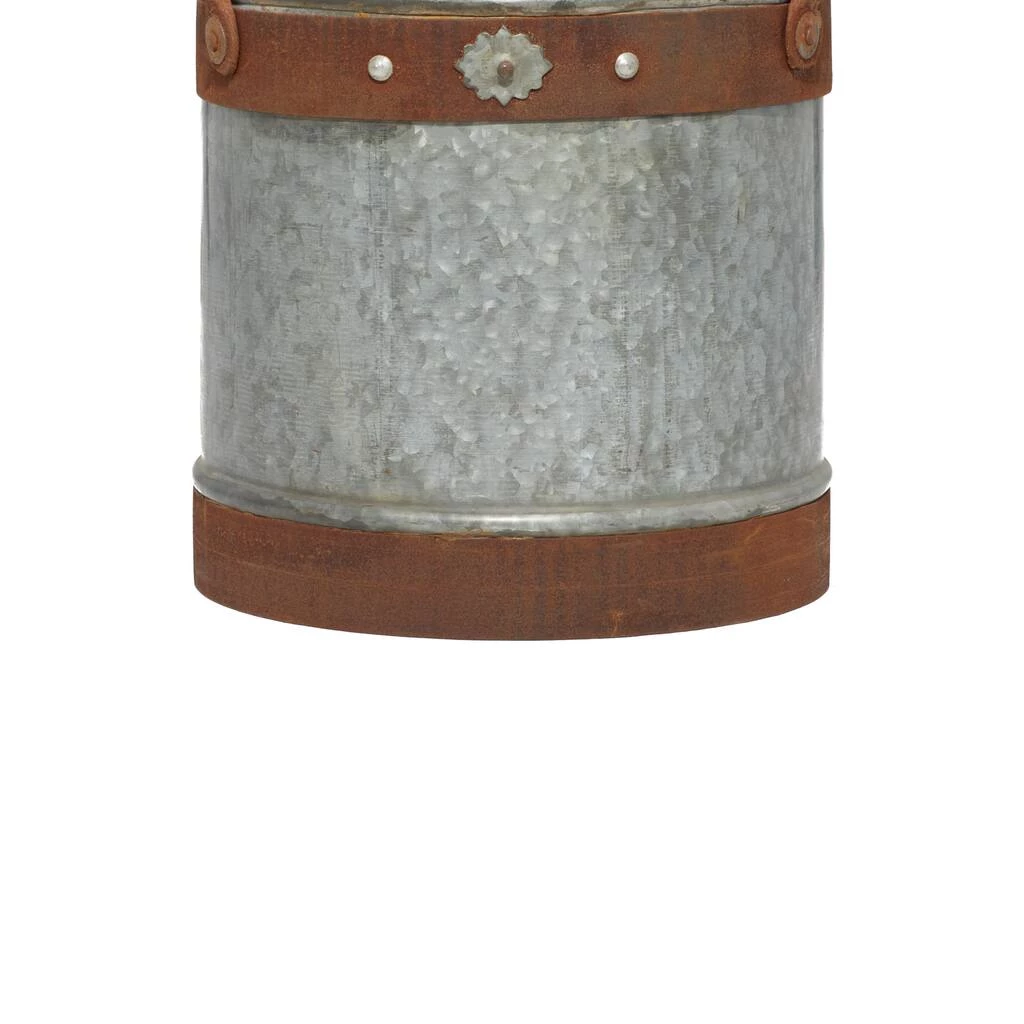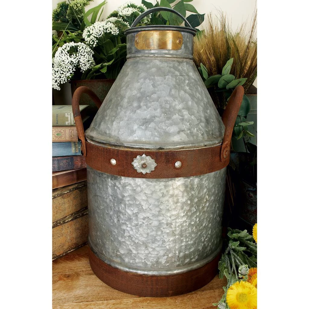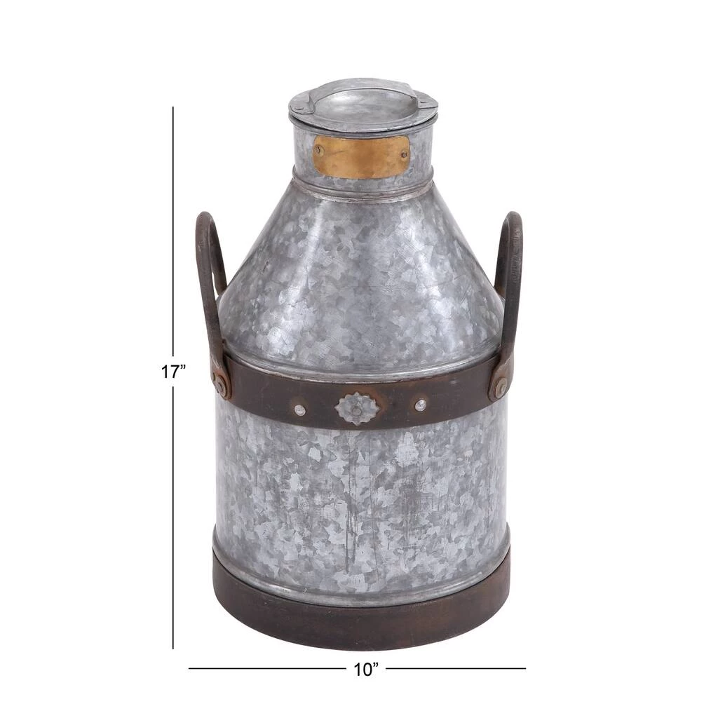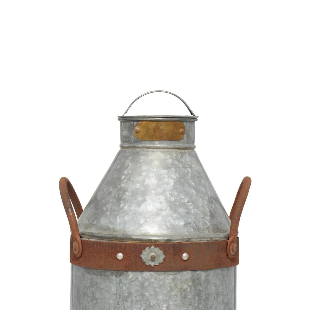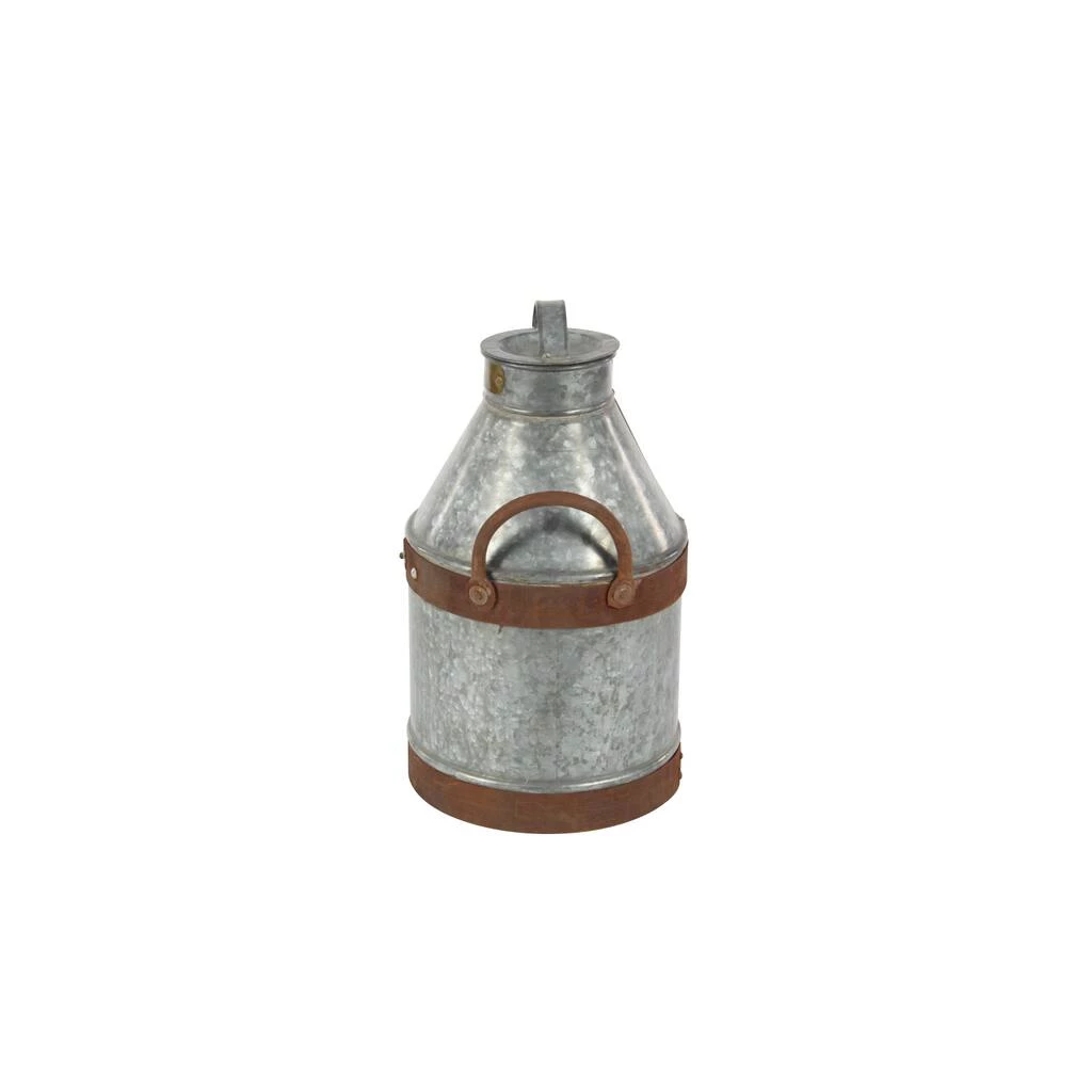 Take a trip down memory lane with this classic metal milk can. Accented with metal bands in the mid-sections for a rustic effect, this milk can is sure to warm up your farmhouse-themed home. With metal handles attached to the mid-section bands and a quick fit lid that snugly attaches to the interior of the can, its neutral gray color and easy to carry size are a perfect compliment to any tabletop or shelf. Displayed solo or with other similar themed décor, this standard-sized galvanized metal milk can will work wonderfully as a cozy tabletop exhibit or vase.