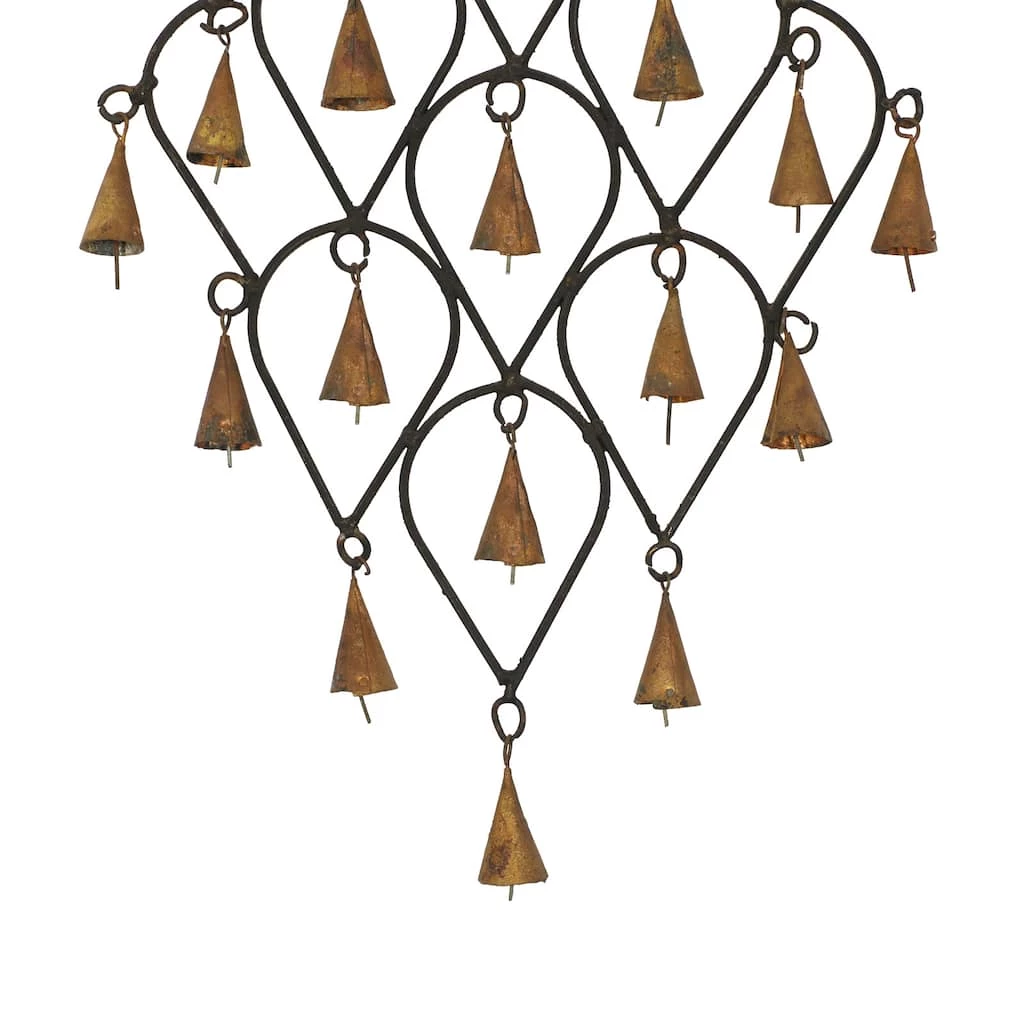 Add more character to an eclectic-inspired space with this decorative iron wind chime. Made in India, this metal dΓ©cor has an elegant frame composed of pear-shaped hoops. A collection of brass-finished bells hang on loops throughout the wind chime’s body. When a gentle breeze blows through, the bells fill the air with a soothing ring.
