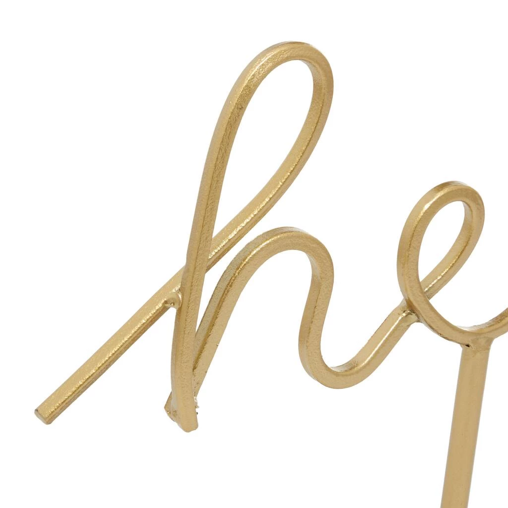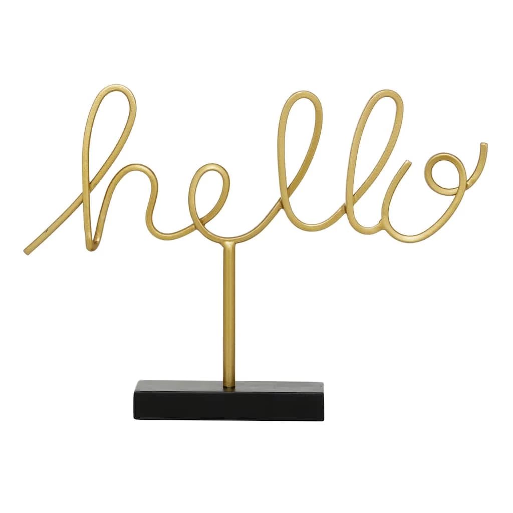 Give a friendly gift, or add some warmth to your own home, with this gold metal “hello” sign sculpture. Iron strips are sculpted into each letter with a hand-written cursive look and finished in metallic powder-coated gold. A matching gold post props the hello sign up, connecting at the rectangular base, which has a matte black finish.