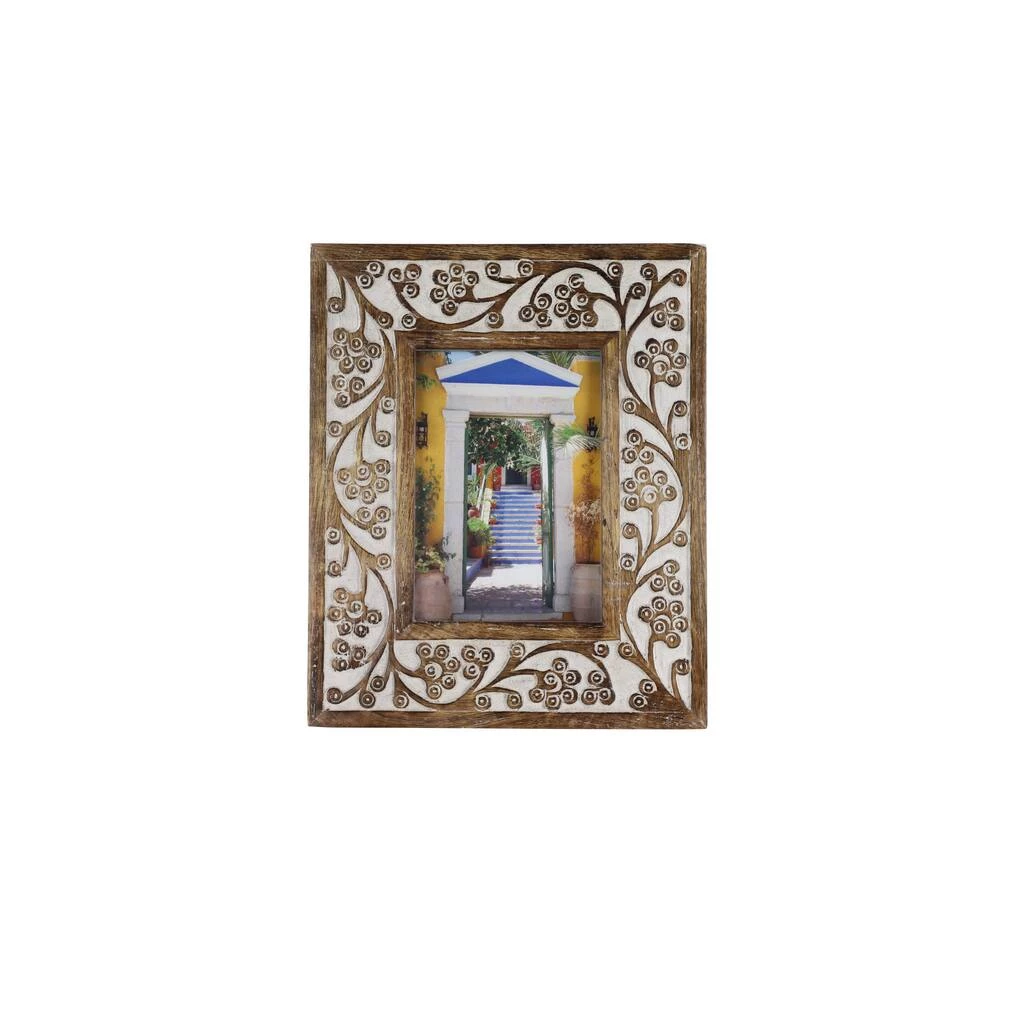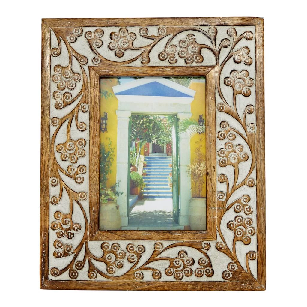 Enjoy this elegant antique picture frame in your foyer, living room, or bedroom to beautifully display your favorite photos. The hand-carved floral detail adds an ornate touch and the whitewash wood finish in the nooks beneath the warm brown wood is soft, creating a lovely vintage look. Due to the handmade nature of this item, no two will be alike, there will be slight differences in shape, size, and color.