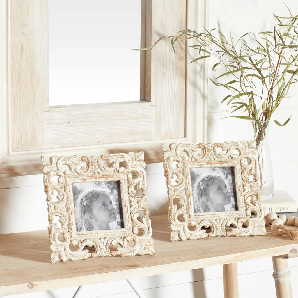 This square picture frame set has hand-carved details, adding an ornate touch with vintage country style. The frame is made of MDF and has a distressed white finish creating a versatile hue that will complement any color palette. Display on a tabletop or shelf with easy-open easel back. Due to the handmade nature of this item, no two will be alike, there will be slight differences in shape, size, and color.