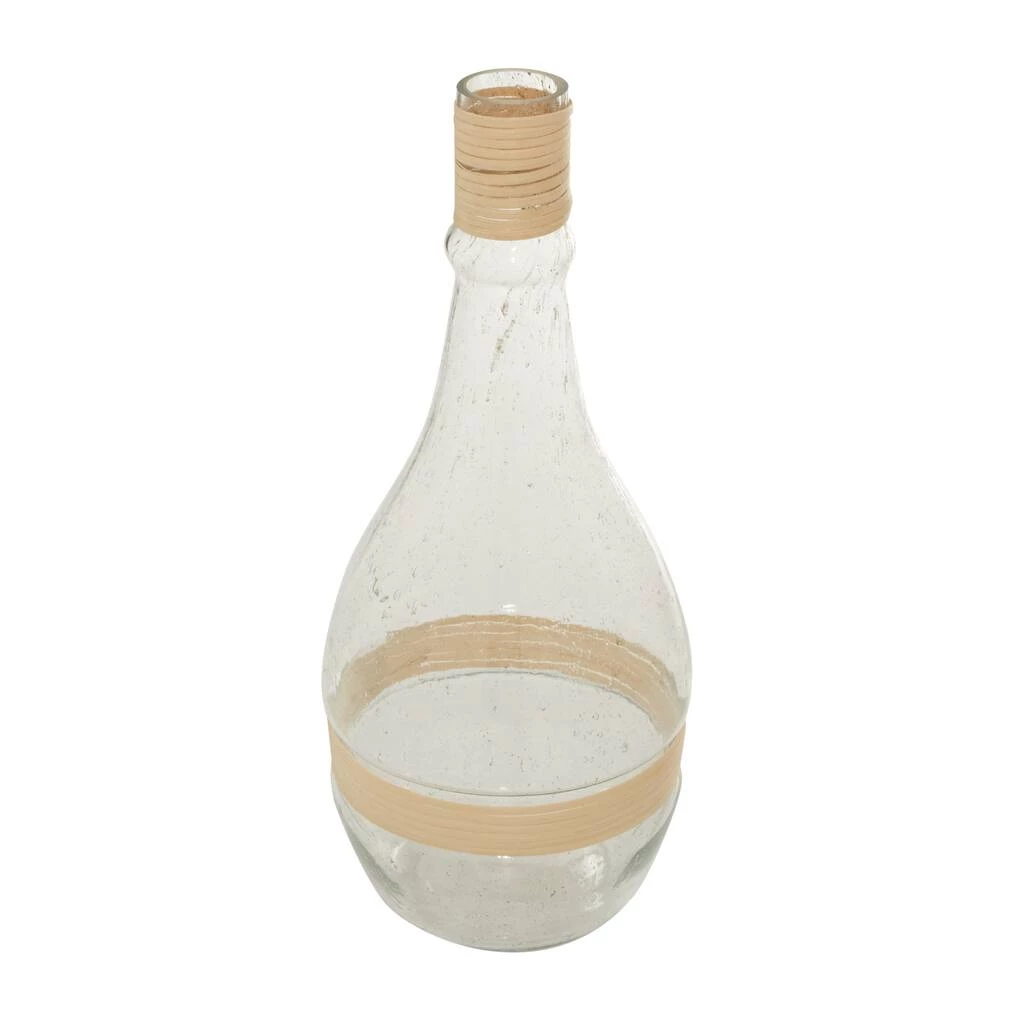 This is a clear glass vase that you will best appreciate in coastal and country chic interiors. It features rattan ropes as focal points of the design, a tainted glass finish, and a bottle silhouette. Put flowers in it, or use it as a stand-alone tabletop decoration. It can capture attention on top of wall dressers, on shelves, and next to wall mirrors.