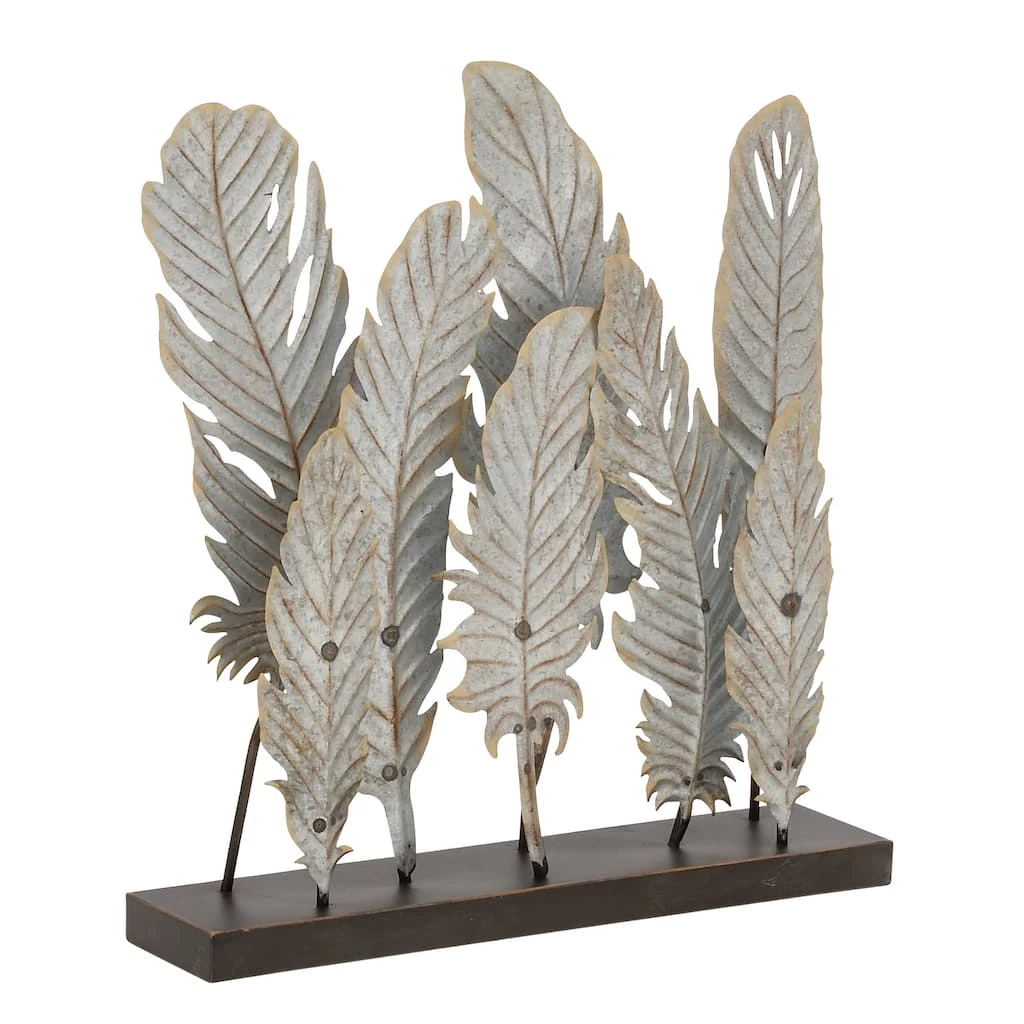 Bring willowy movement with deep texture to your desk, tables, or shelf with this white feather table dΓ©cor. Eight iron feathers in staggered sizes and heights are standing upright on a black rectangular metal base. Each feather has rich detail and is finished in an antique white with heavy distressing. Light beige edges bring a slight vintage effect to this otherwise very contemporary accent dΓ©cor. This feather sculpture will definitely beautify your contemporary style interior set up when displayed on shelves or tables.