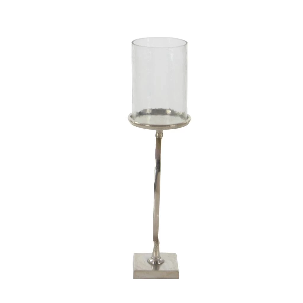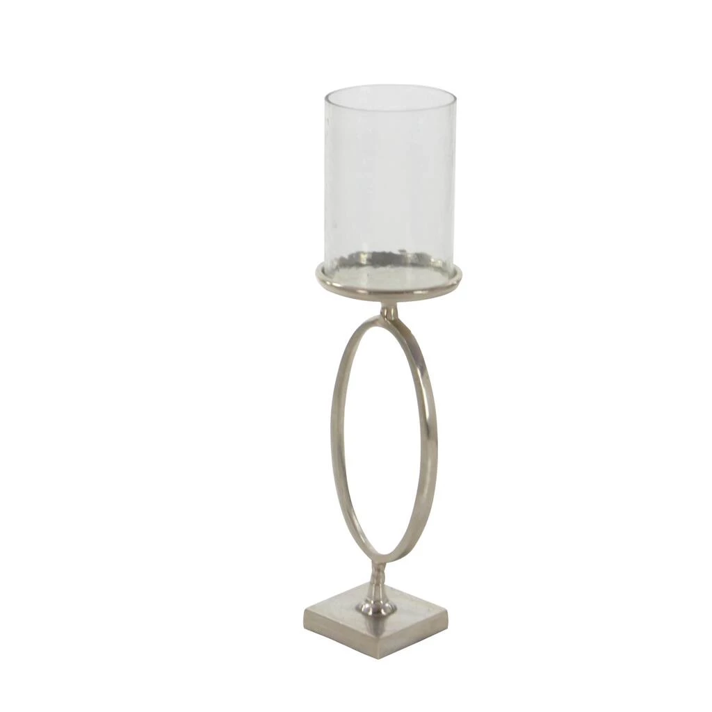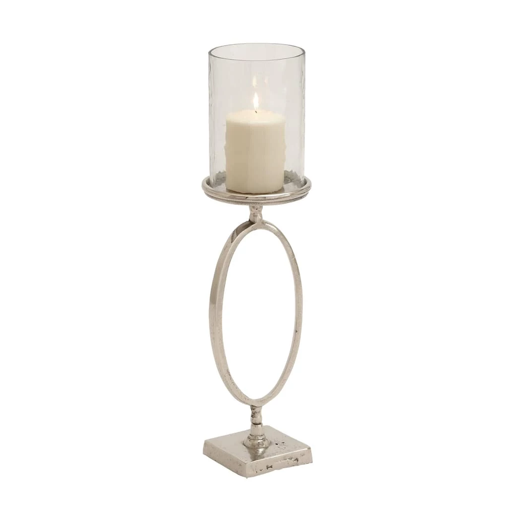 Bring contemporary sculptural style with ambient illumination to your space with this large metal candle holder, featuring a large circular center sculpture. The elevated pillar candle holder top features a dimpled clear hurricane glass, keeping your space protected while also adding stylish texture. The overall finish is a metallic silver that will work with any color palette in your home or office. This holder was designed with black rubber stoppers at the base that prevent scratching furniture and table tops, as well as sliding around.