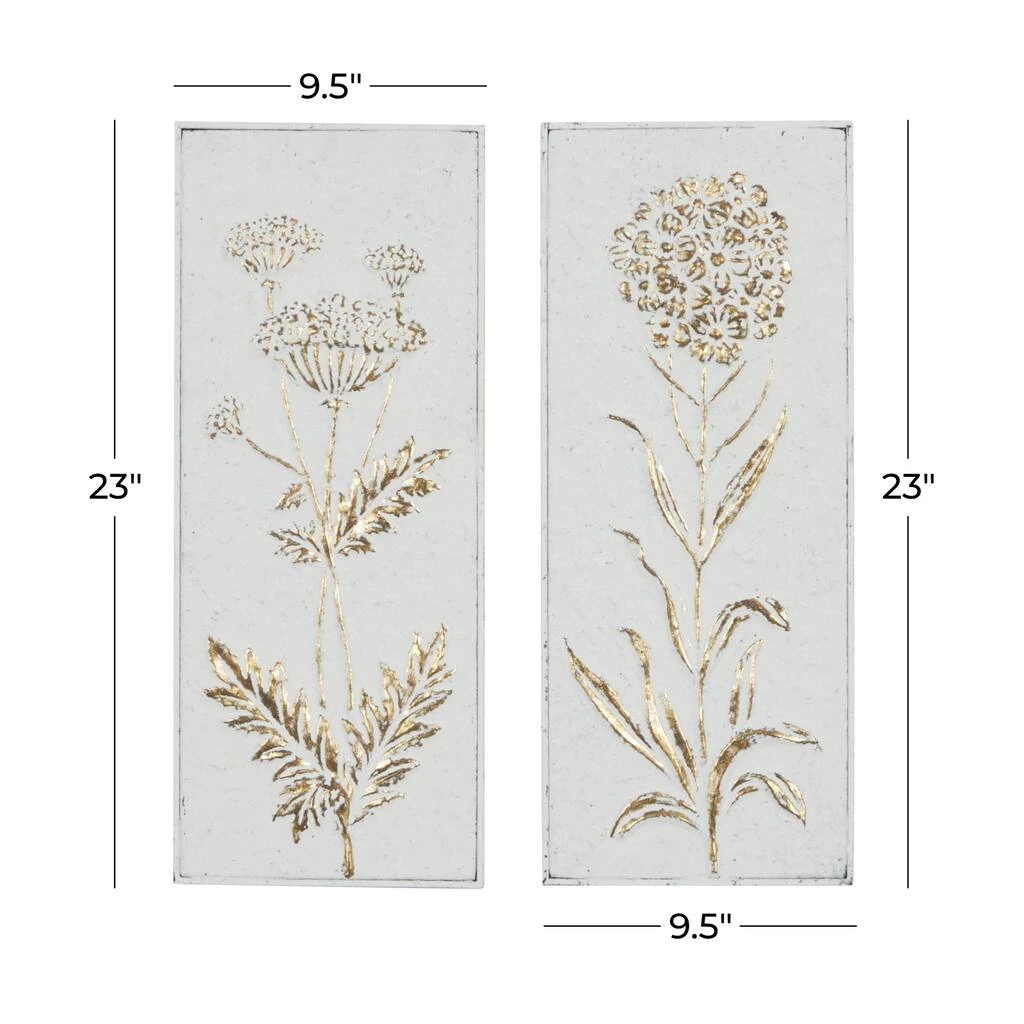 These hammered metal wall dΓ©cor panels boast various textures and indentations to create floral relief art. The lightweight iron is finished in a matte eggshell white color with distressing around the high points to add depth and articulate the botanical designs, revealing metallic gold. Featuring easy and ready to hang hardware backing, this lovely duo will work with any color palette or pattern. These rectangular art dΓ©cor comes as a set of 2.