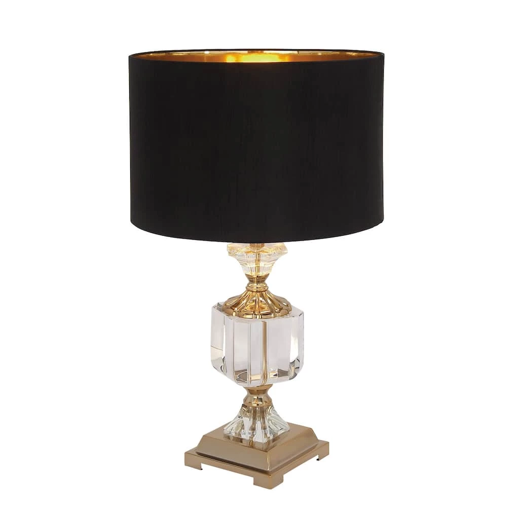 Impress visitors with this refined lighting dΓ©cor. Gold colored iron accents stand out against the lamp’s clear crystal body. The lamp’s black drum shade adds dimension to the space and features a gold interior. The fixture is a gorgeous complement to a glam style living room or bedroom.