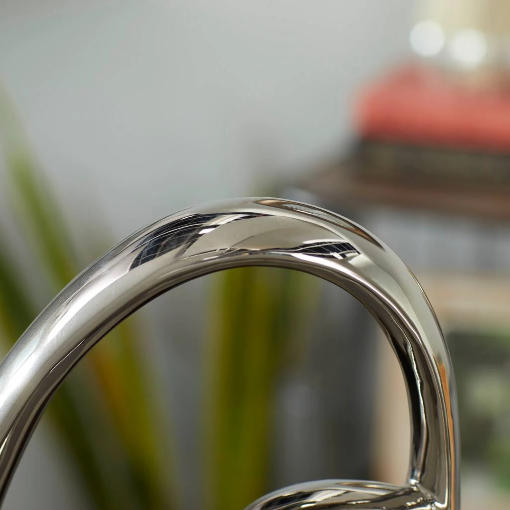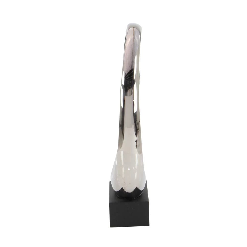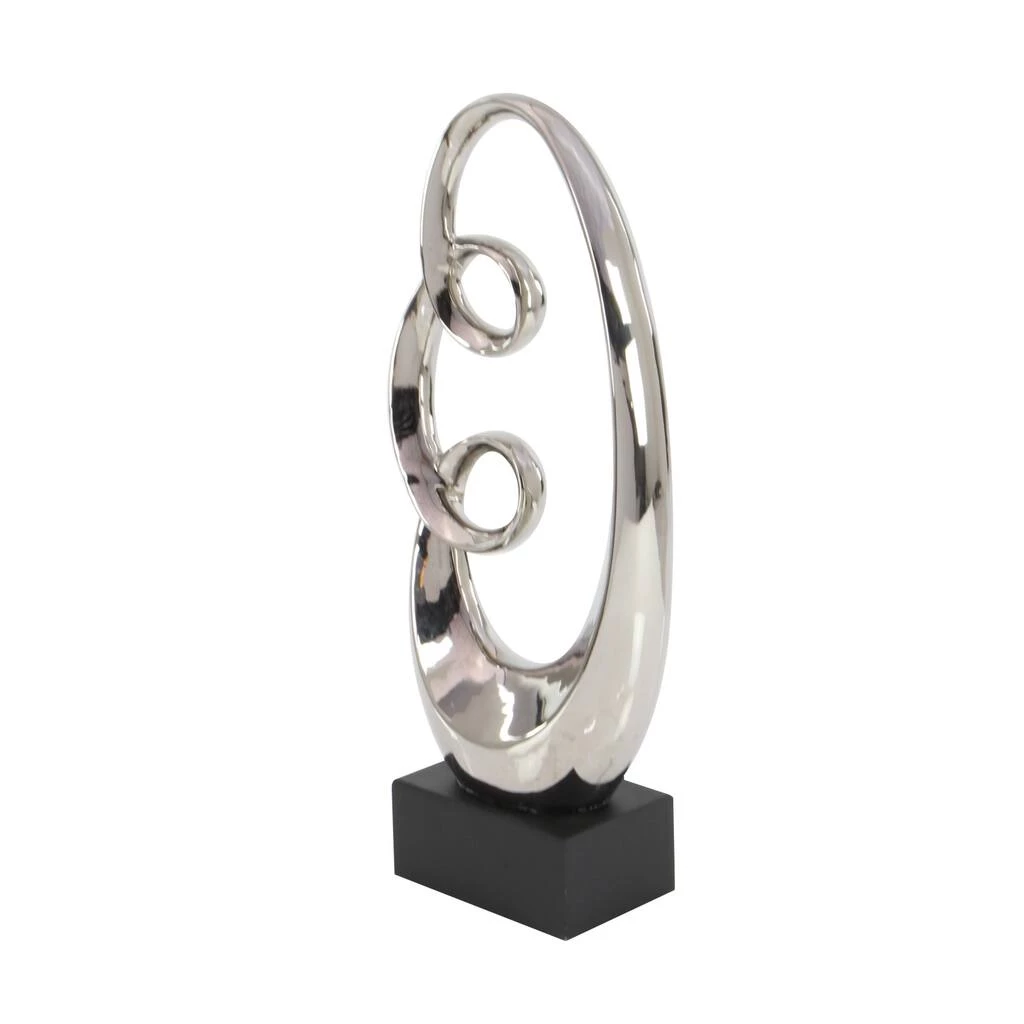The elegant movement and smooth, reflective finish of this 24″ Silver Ceramic Modern Abstract Sculpture is sure to bring a high brow art essence into any space. Two round, smooth exaggerated loops are molded by fired ceramic with an electroplated silver finish for a reflective metal look. This abstract formation is adhered to a black wooden cube base that elevates this silver sculpture in style. The base has rubber stoppers to prevent scuffs and sliding, ensuring your surfaces are protected. Display on top of a polished dark brown wood surface with modern-themed decorations to best appreciate the design. Designed with black rubber stoppers at the base that prevent scratching furniture and table tops, as well as sliding around.