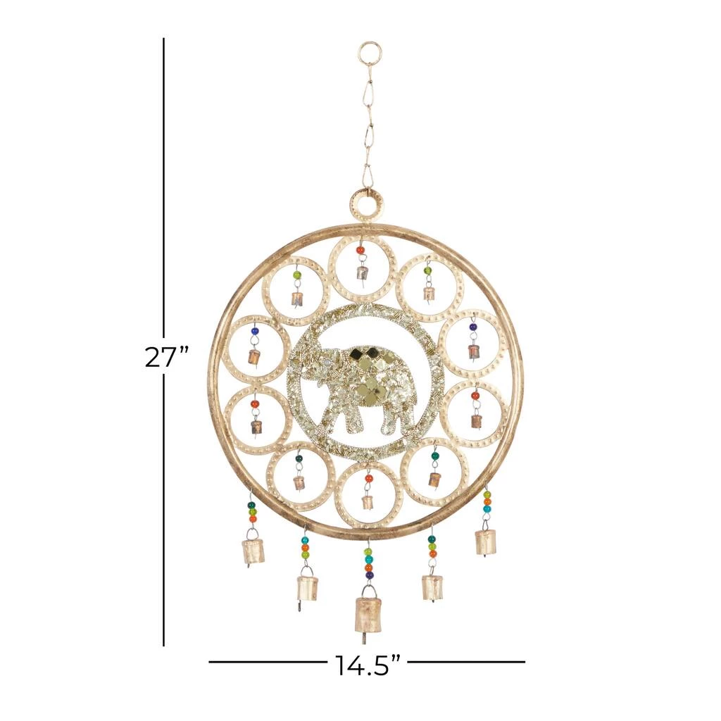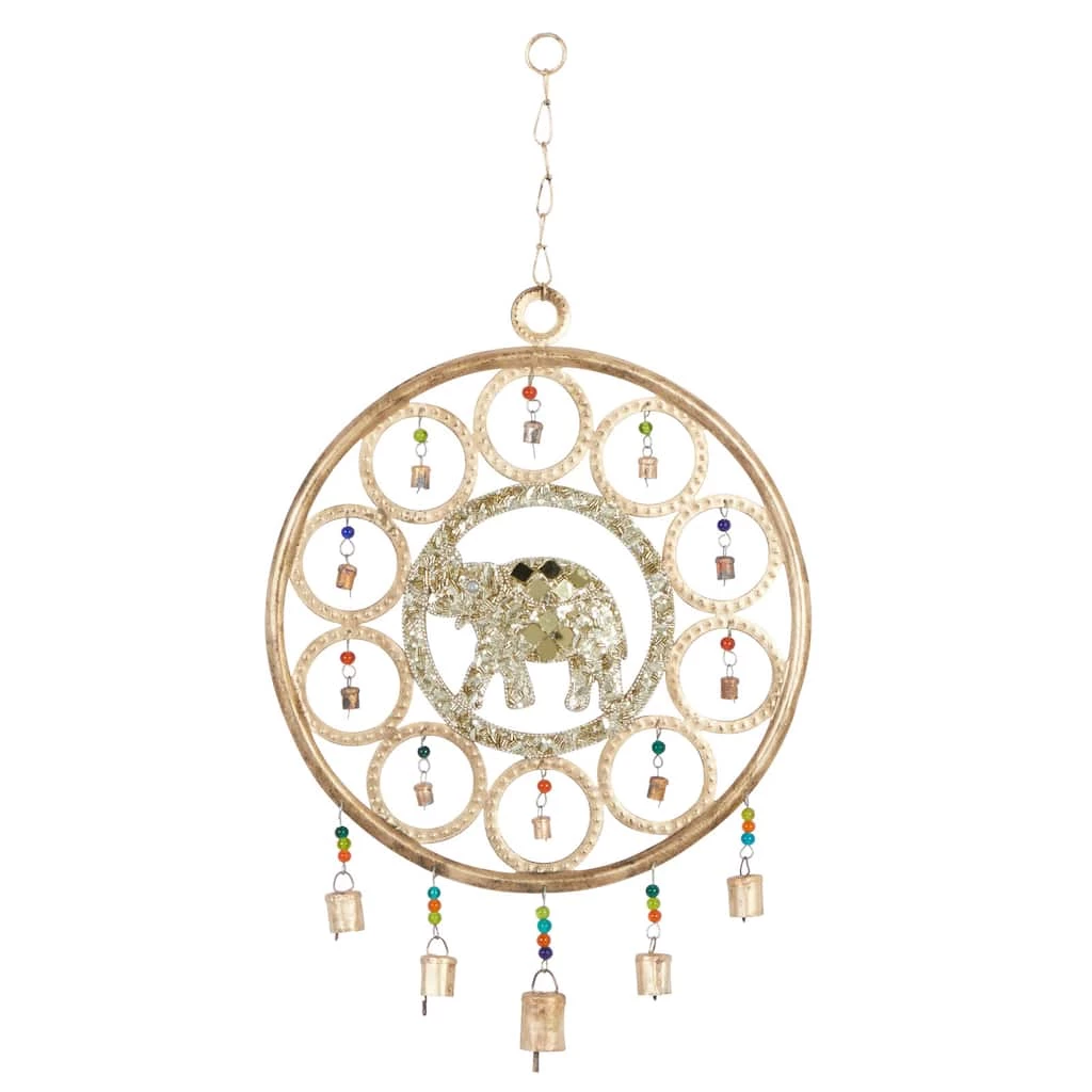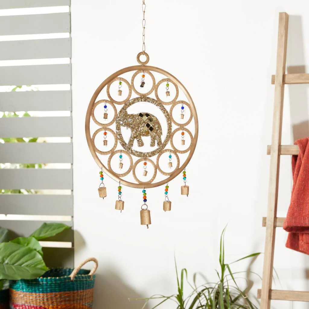 This charming gold-colored home dΓ©cor showcases a round ‘dreamcatcher-inspired’ windchime design made of pure iron material and multi-colored glass beads. They are designed with a bead-studded elephant figure in the center and ten embossed iron circles containing one iron bell and one glass bead each. They are ideal home decorations for entryways, living rooms, balconies, outdoor gardens, and backyard patios.