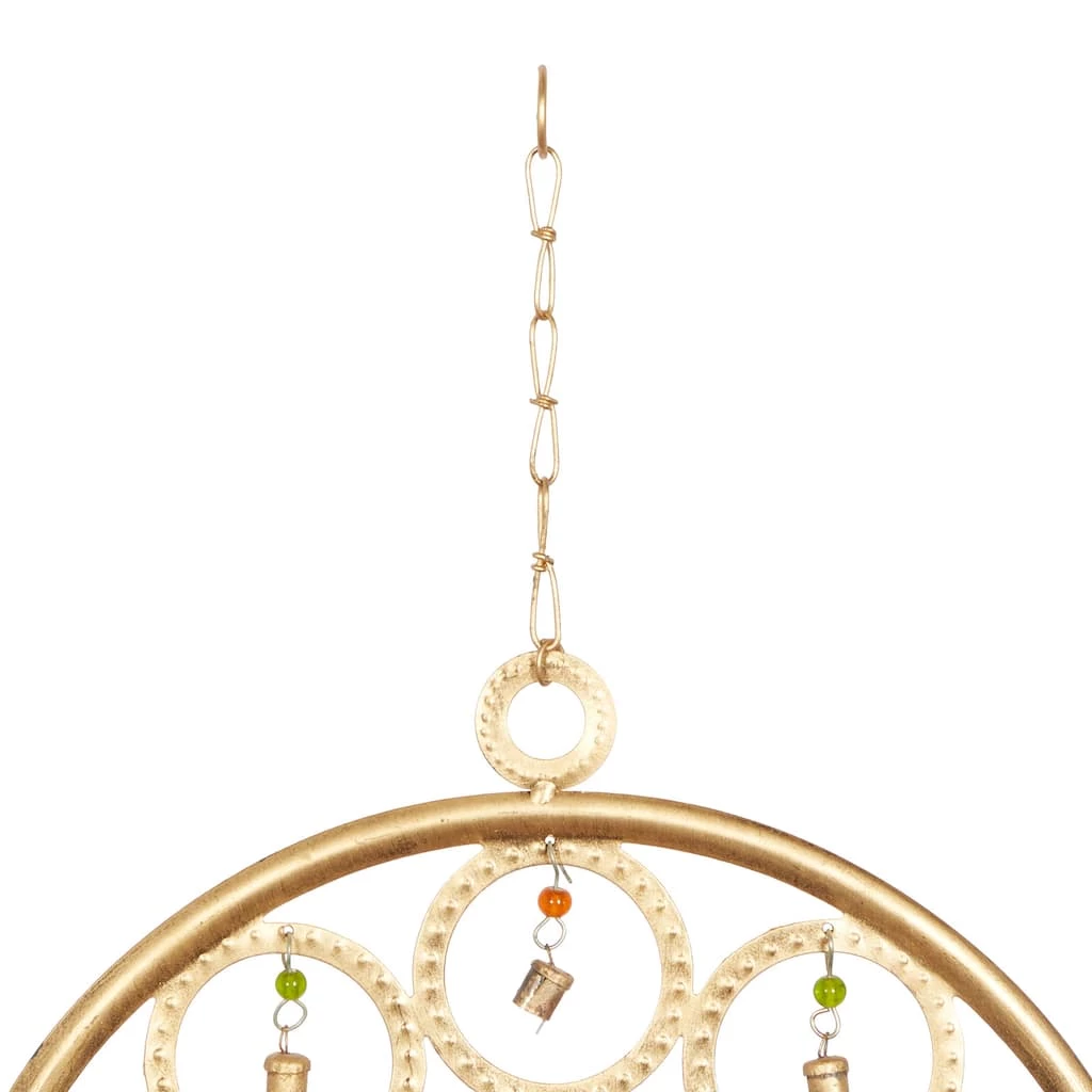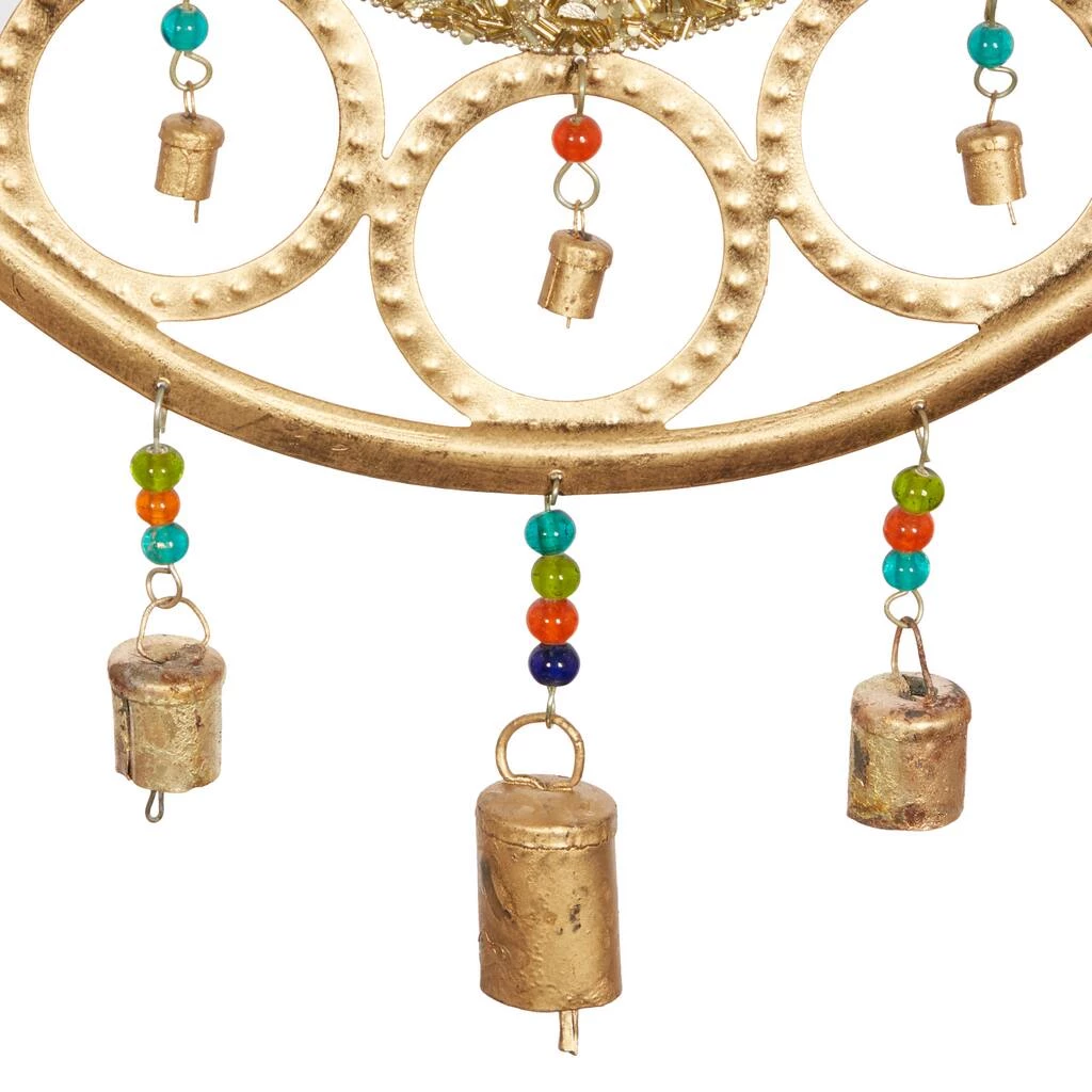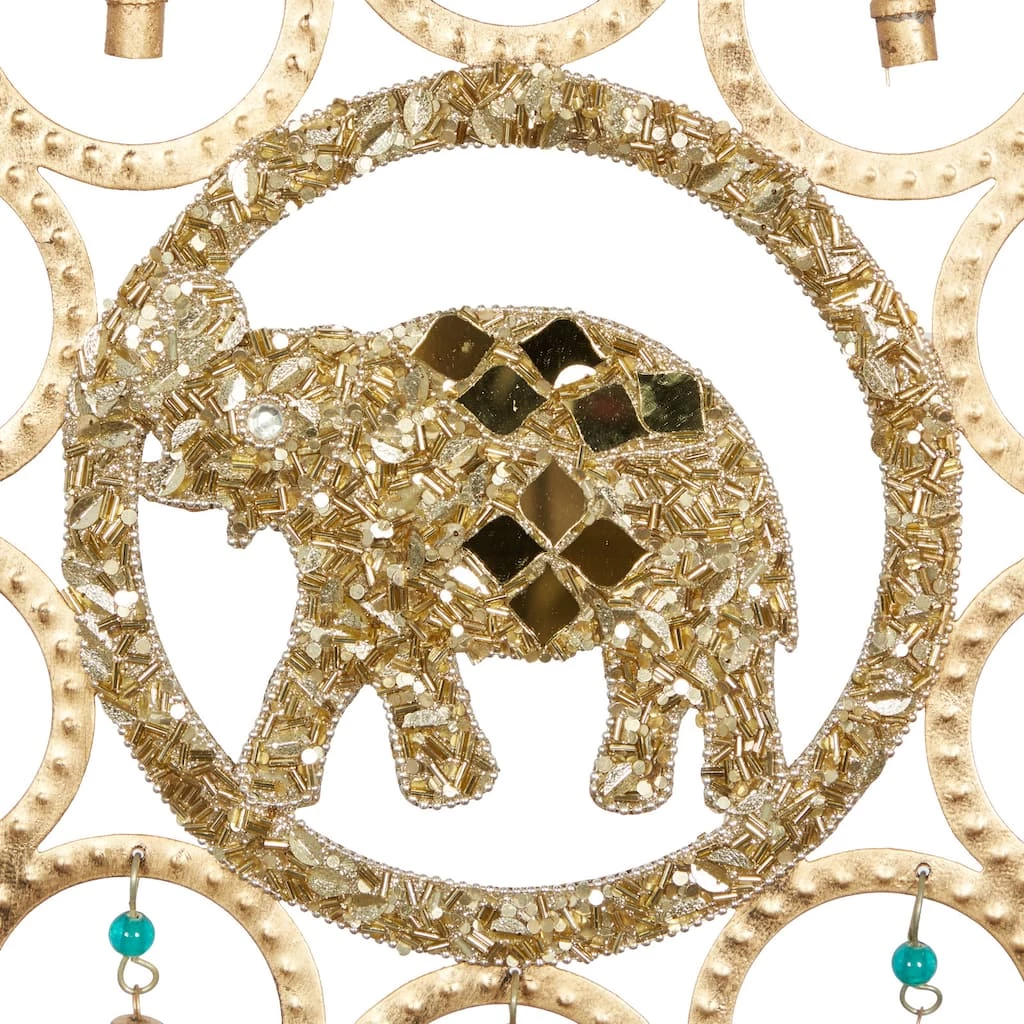 This charming gold-colored home dΓ©cor showcases a round ‘dreamcatcher-inspired’ windchime design made of pure iron material and multi-colored glass beads. They are designed with a bead-studded elephant figure in the center and ten embossed iron circles containing one iron bell and one glass bead each. They are ideal home decorations for entryways, living rooms, balconies, outdoor gardens, and backyard patios.