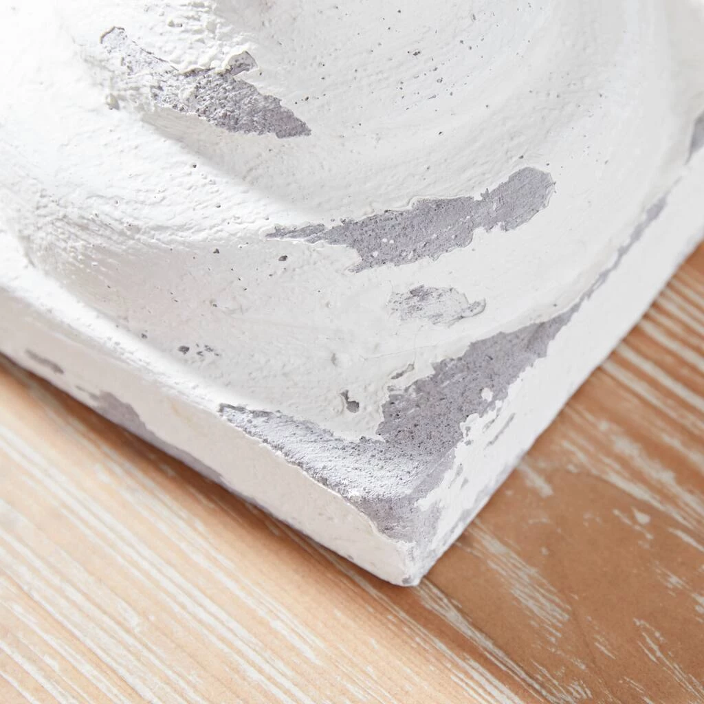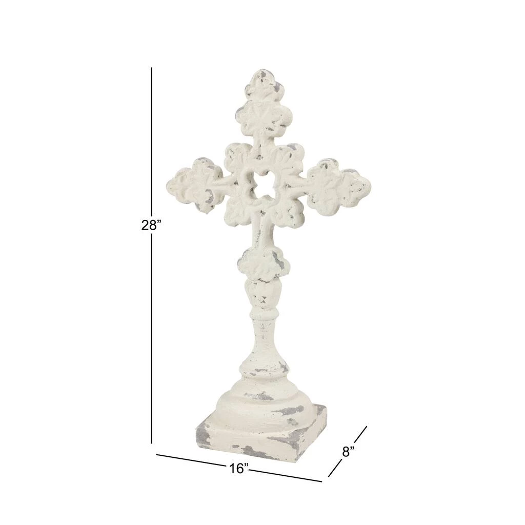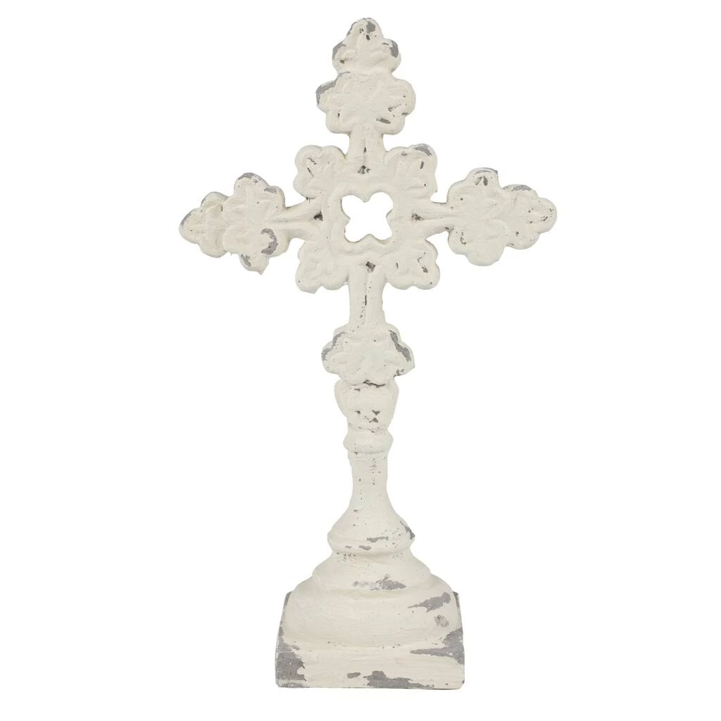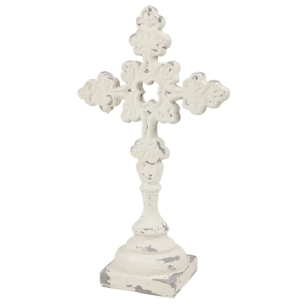 Bring antiquated style to your space with this large, white cross sculpture. This large cross has carved embellishments, creating leaf-like designs throughout the rounded arms’ silhouette that meet in the center where a carved-out quatrefoil adds even more dimension. Decorative chipping and speckling over the white paint revealing a soft gray hue beneath creates an authentic vintage feel. The neutral hues of this textural white shelf decor will work with any color palette. Get that bold and rustic look on your console or coffee table with this cross sculpture. Designed with rubber stoppers at the base that prevent scratching furniture and table tops as well as sliding around.