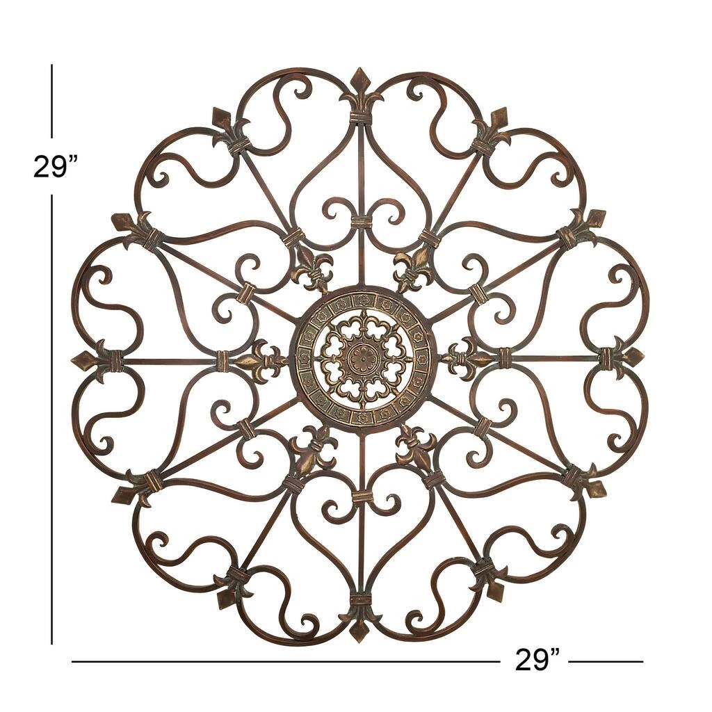 Bring antique charm to your wall décor with this gilded, vintage style gold metal wall art. Carved metal fleur de lis designs and scrollwork create an ornate 3D snowflake shape with a decorative emblem in the center. The textural dark gold finish works with any color palette and adds an extra vintage feel to this lovely accent décor. Easy and ready to hang by hardware in back.