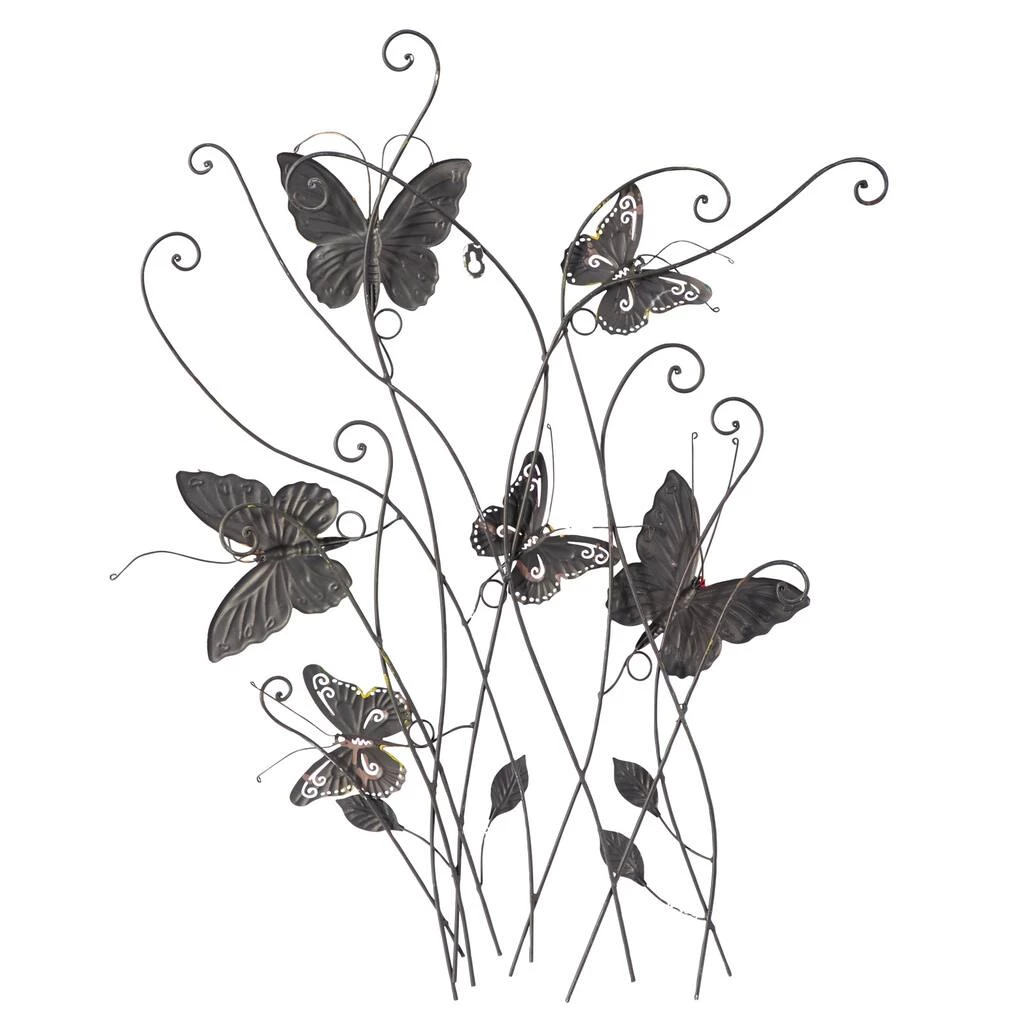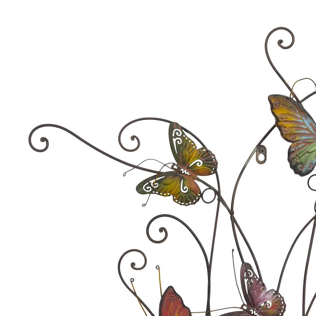 Add a touch of living nature to your exterior or garden area using this iron butterfly wall decor, which hangs vertically via a keyhole backing. This outdoor metal wall art features 6 colorful butterflies floating along a scrolling branch with leaves. The wings are painted with blending colors of red, green, blue, and yellow to suit any garden theme concept. It may work as an indoor tropical wall fixture as well.