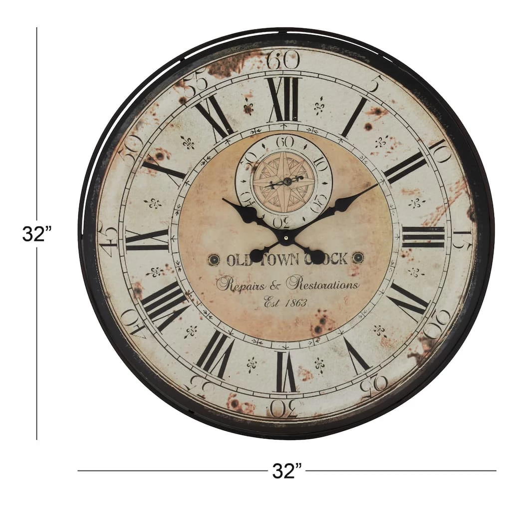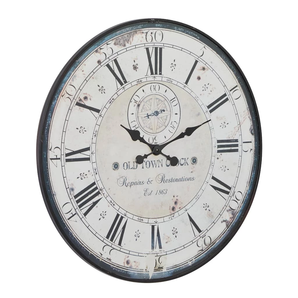 Rich in character, this 32″ White Wood Vintage Wall Clock reflects a rustic, vintage aesthetic. From its black, round, wrought iron case beneath textured dark brown brush strokes, a distressed white and beige wood face with decorative burnt rust-look markings, and bold Roman numerals around its analog dial with ornamental hands, this clock has loads of character. Suiting any room, this decorative clock makes a great addition anywhere in your home. This round, large wall clock also features a small seconds timer with its own small decorative arm for supreme time accuracy. In serif and embellished cursive fonts, the face of the clock reads “OLD TOWN CLOCK Repairs & Restorations Est 1863” on the printed face for added unique charm.