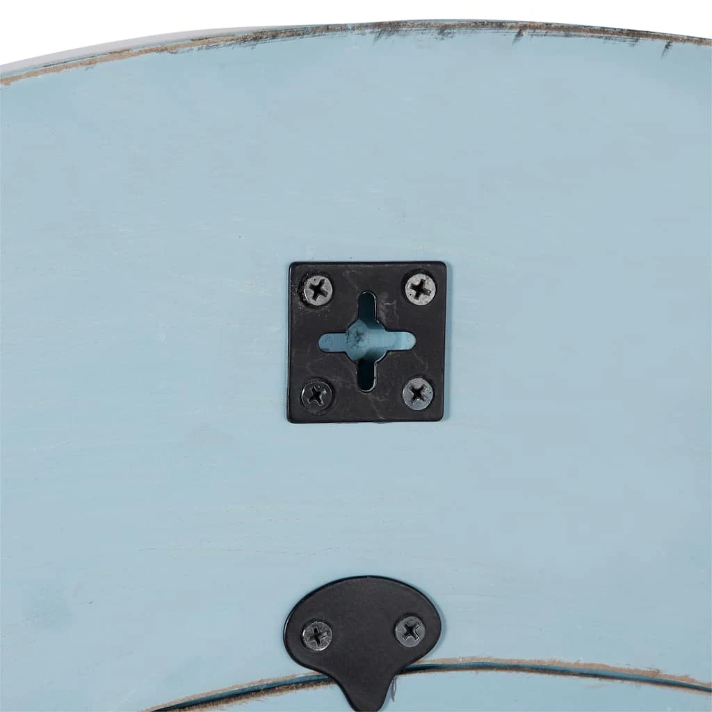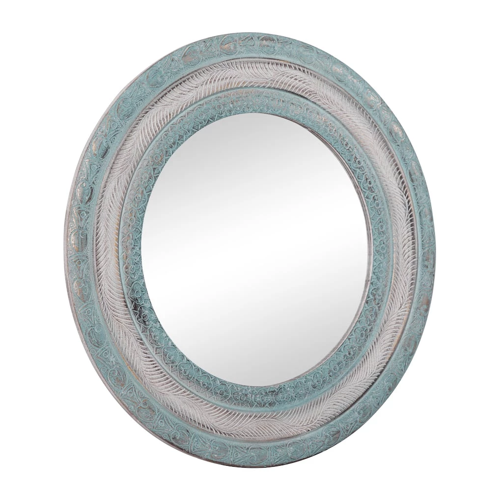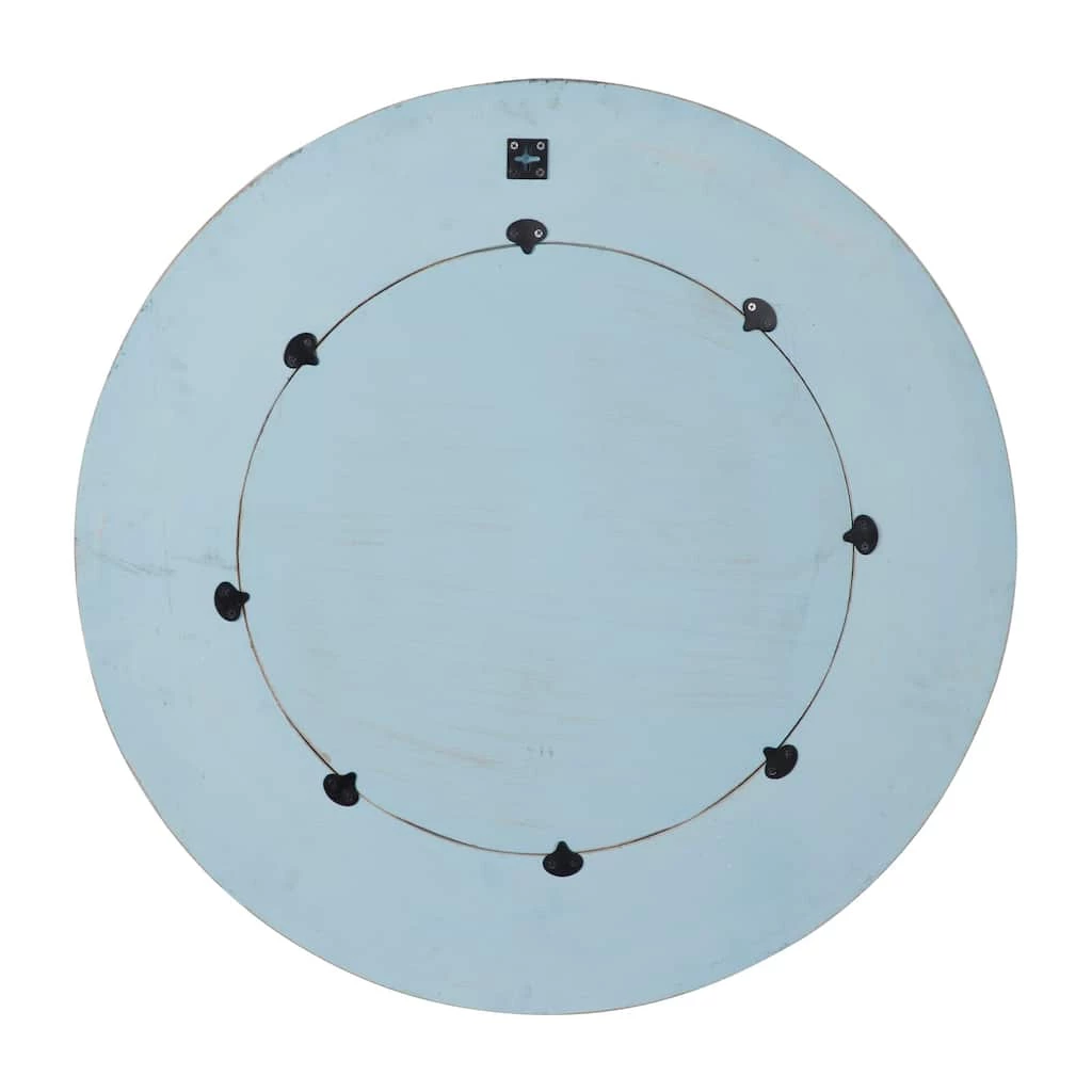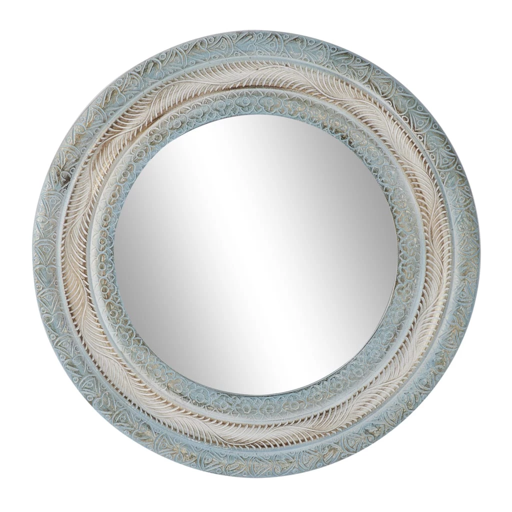 Add a touch of whimsy in your traditional inspired home with this extra-large round mirror. The mirror features an engraved rustic wood frame painted in a distressed powder blue and champagne beige finish. Cheery and natural, this extra-large round mirror with wood frame is a great focal point in any farmhouse and traditional themed homes.