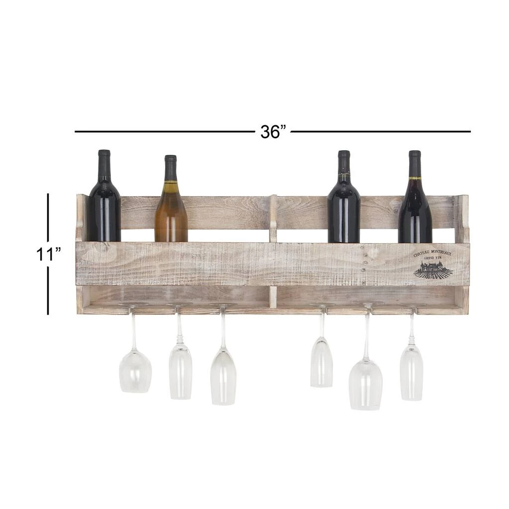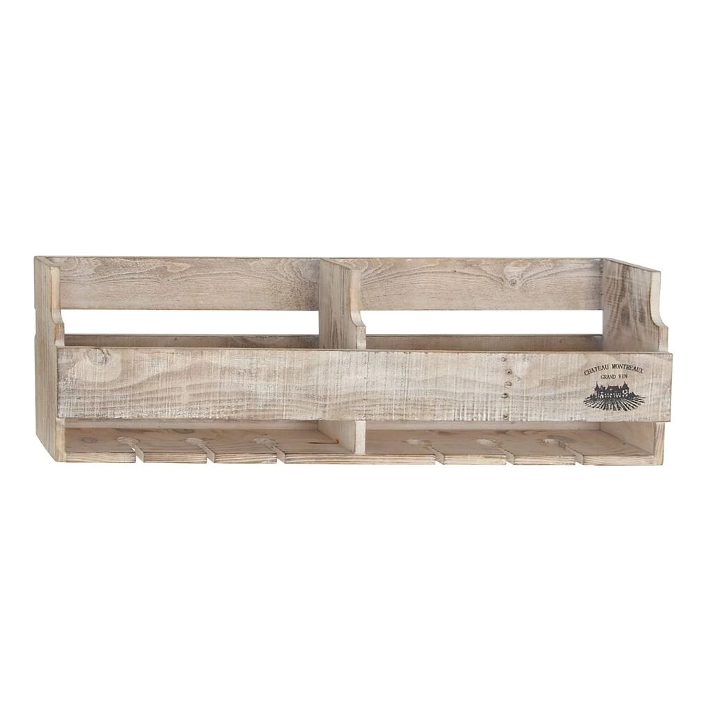 Display and organize your wine bottles and glasses with this whitewashed brown wood cabinet holder and make everyone thirsty with envy. It looks stylish in your living room or kitchen as a way to display and serve your favorite wines. This wall wine rack holds 10 standard-sized wine bottles and 6 wine glasses. It’s made from textured light-colored fir wood and features a “Chateaux Montreaux Grand Vin” logo in black paint.