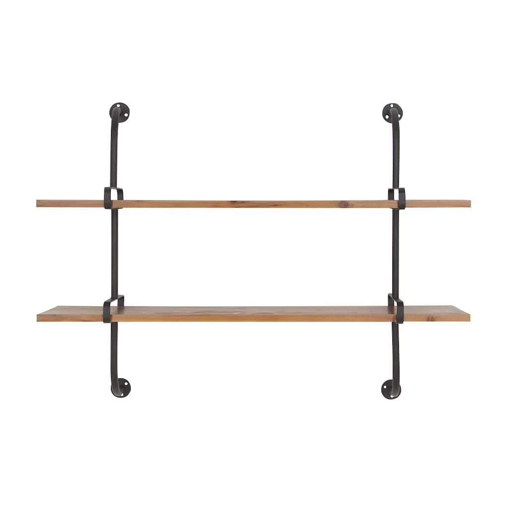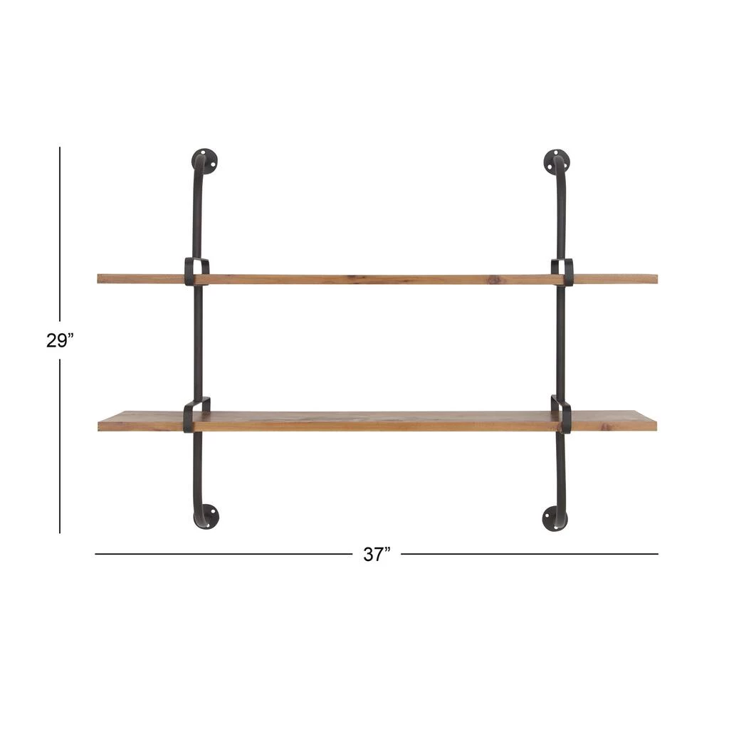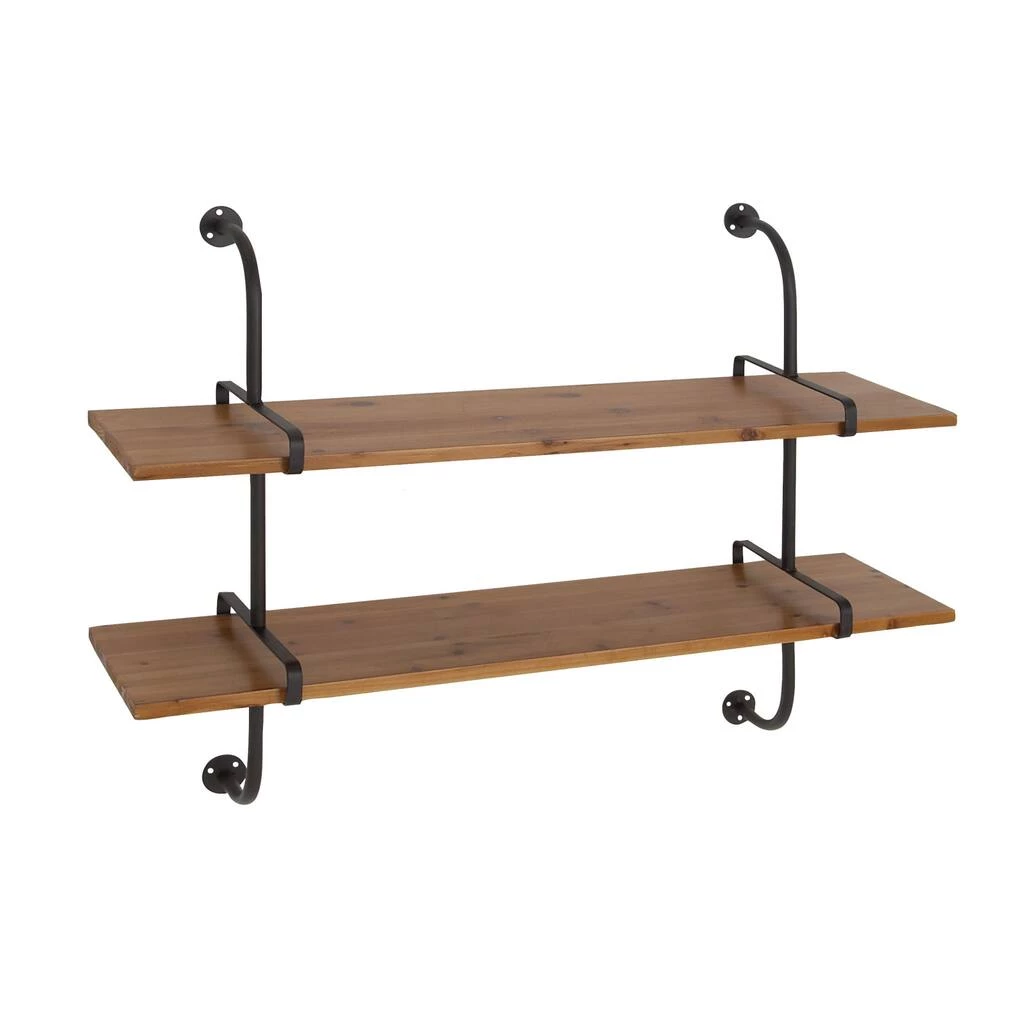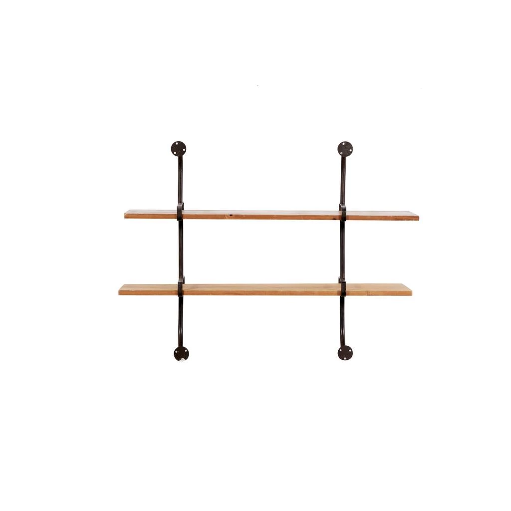 Organize your home or office with this stylish wall shelf unit. Two natural golden brown solid wood shelves are cradled by sturdy black iron bars that screw into your wall to create a floating shelf effect. The cool metal and earthy wood are the epitome of industrial style while being versatile enough to work with any theme or style scheme.