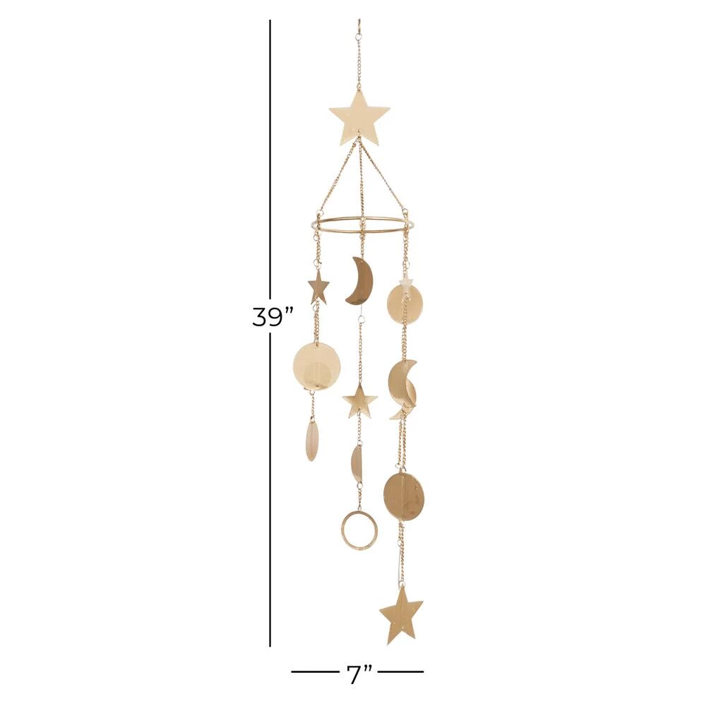 Bring the stars and the moon down to earth with this celestial wind chime. Metallic stars and moons hang down in tiers, bringing a whimsical feel to any space. Made in India, the chimes feature 100% iron, and this shimmering dΓ©cor will reflect sunlight on a beautiful day. Hang this metallic wind chime on your porch or in your garden to delight your guests. Or hang it indoors, where it can lend its gold color to an eclectic-style room.