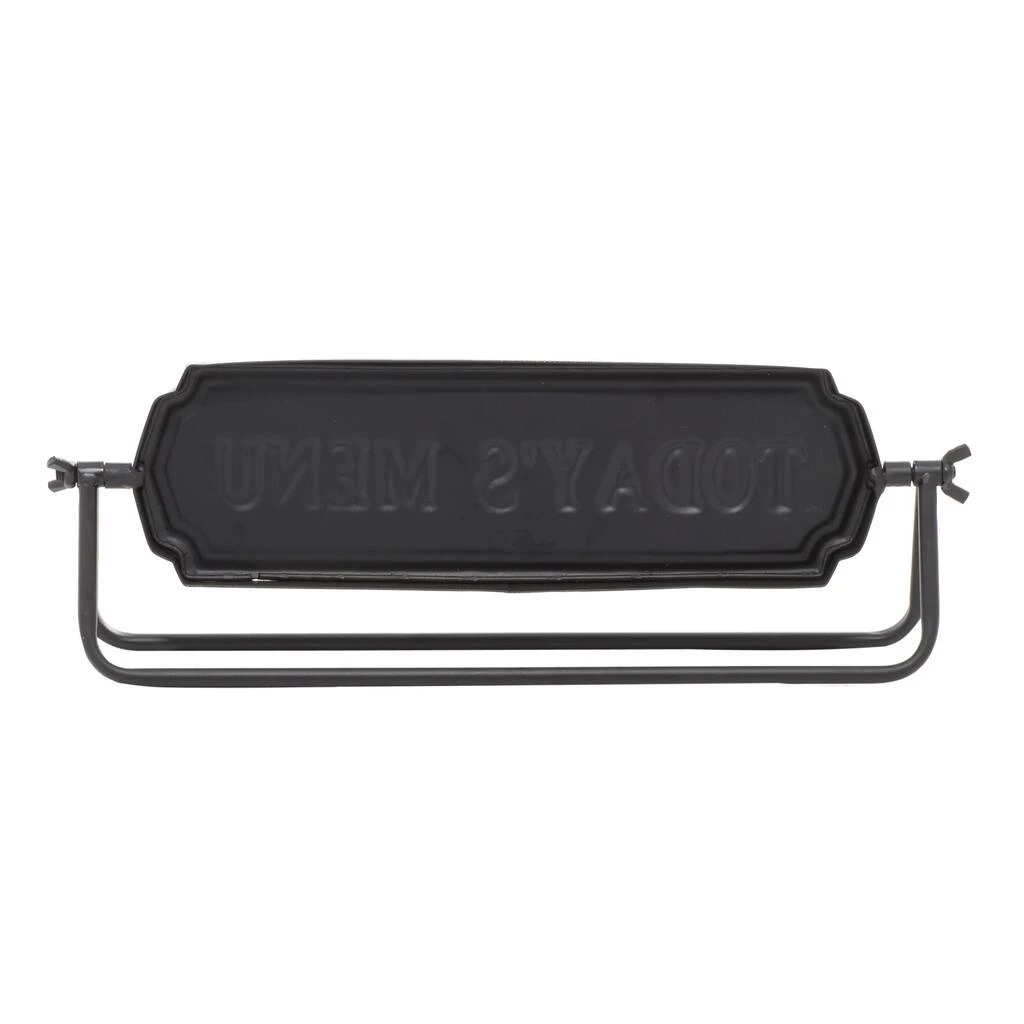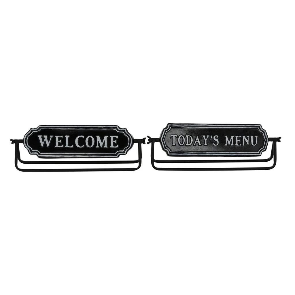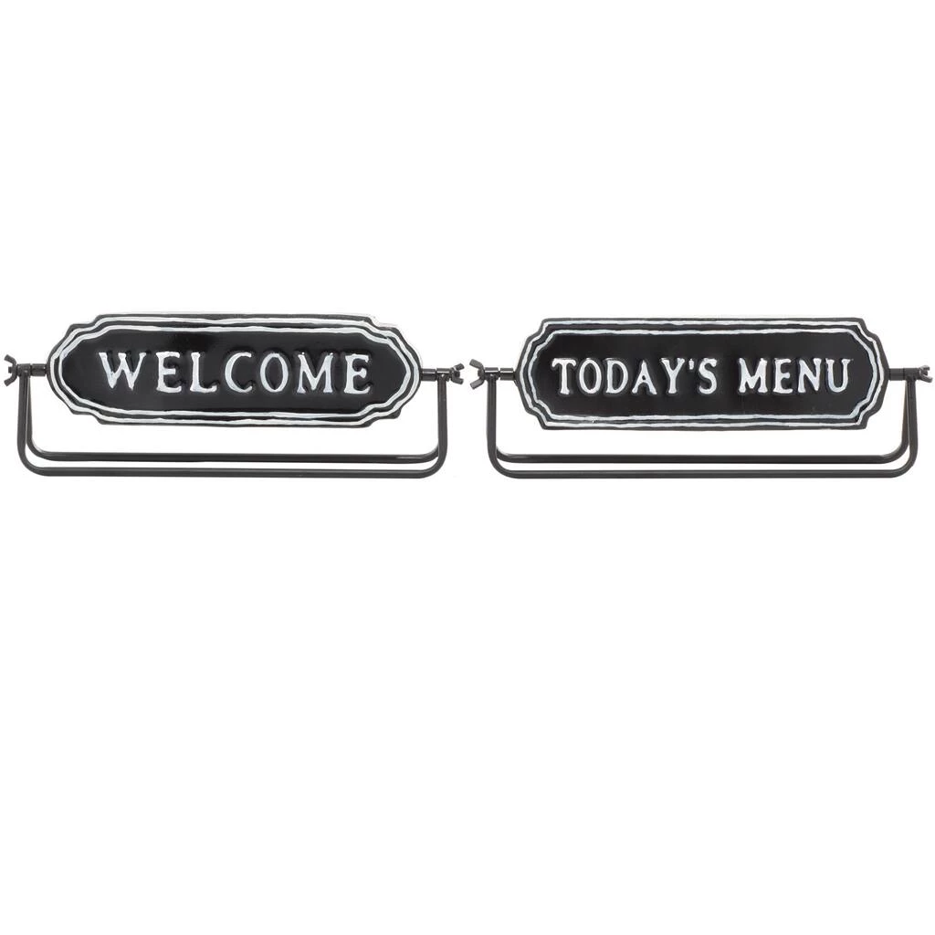 Add some friendly charm to your farmhouse kitchen with this pair of black metal table décor signs. Each rectangular sign features embossed all-caps serif lettering, reading “WELCOME” and “TODAY’S MENU” script. Around the sign lettering is hand-painted white trim outlining the antique sign shapes. The easel back bases provide sturdy upright support on any surface.