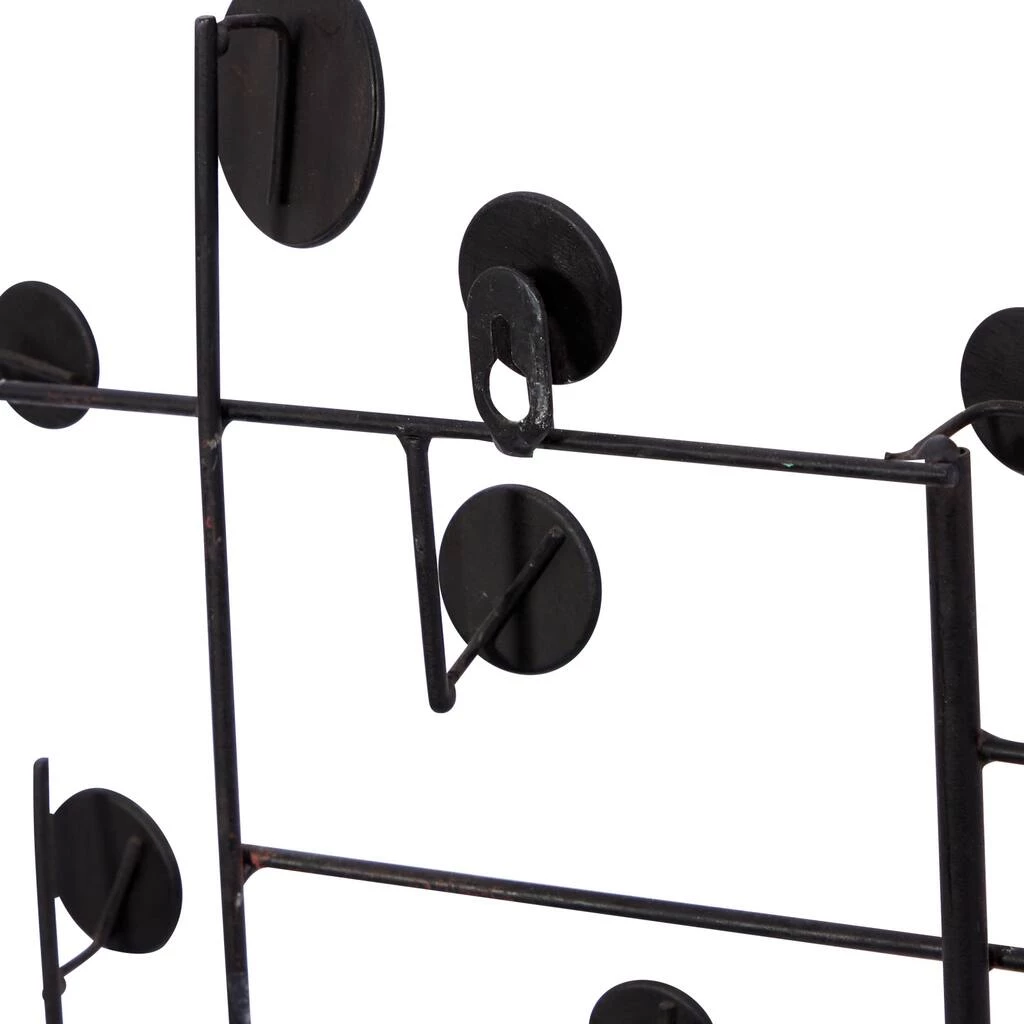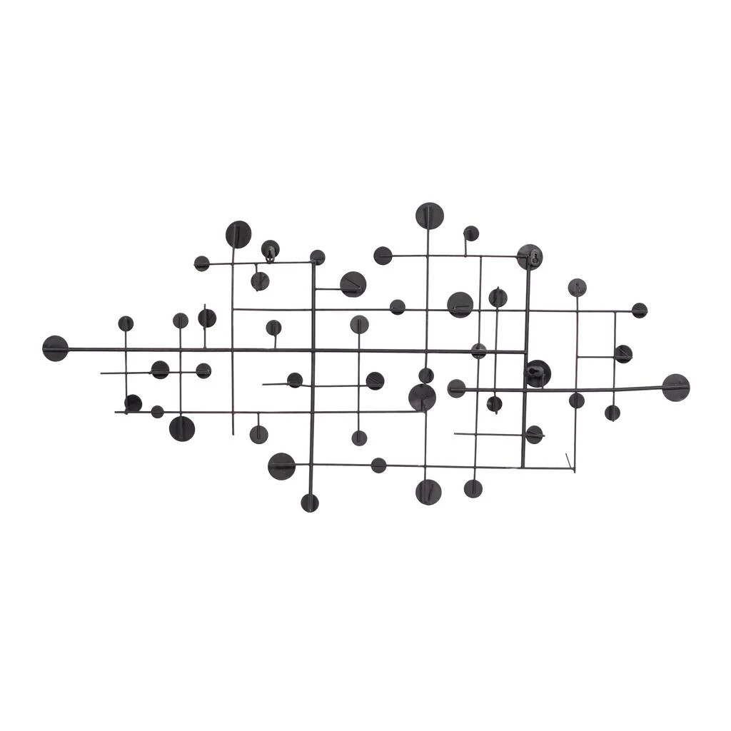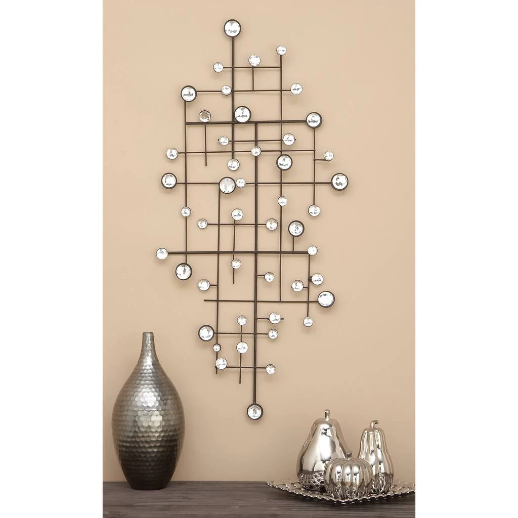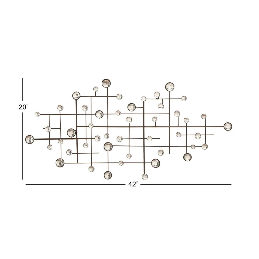 Create a glam statement in your home with this geometric metal and glass wall dΓ©cor. This abstract art piece is a glamorous addition to modern and contemporary homes. The overlapping metal bars with a matte taupe finished are embellished with shiny glass beads, creating a shimmering art spectacle, especially when hit by gorgeous light. Item is ready to hang by keyhole slot in the back. Suitable for indoor use only. This item comes shipped in one carton.