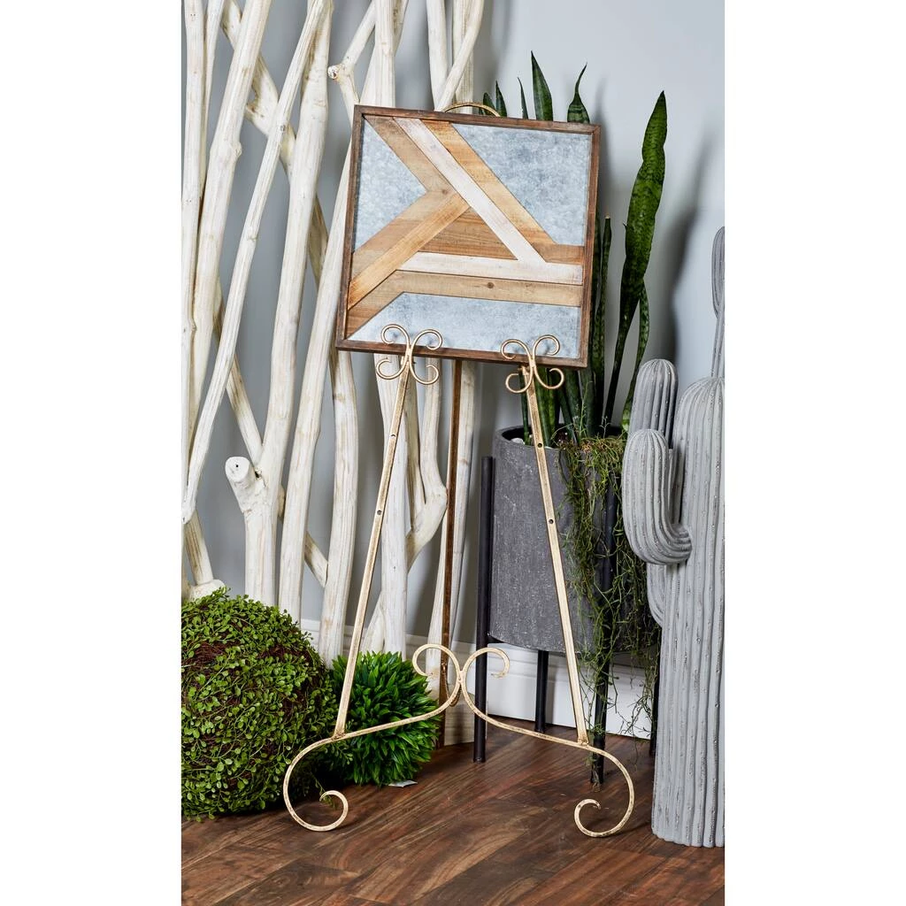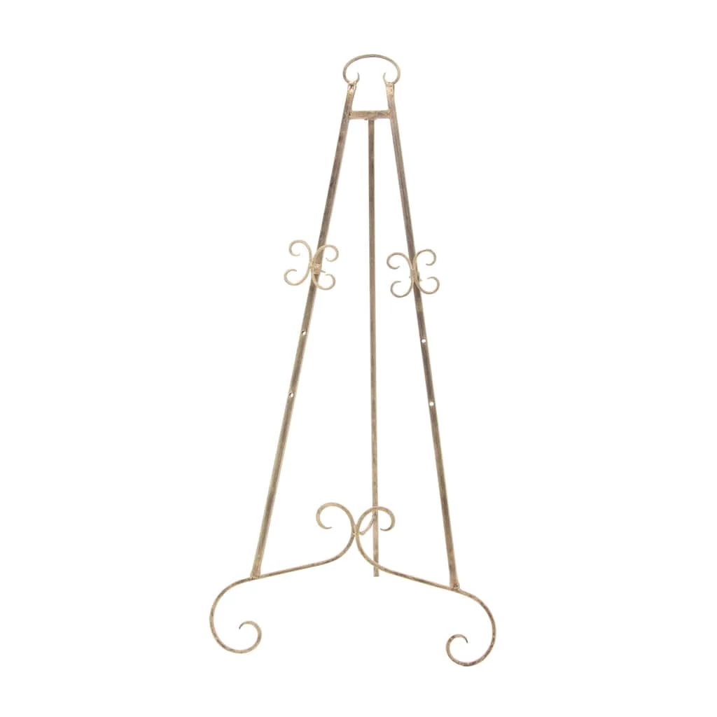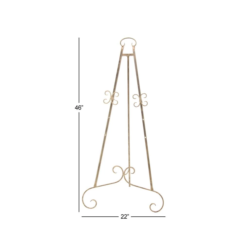 Cast some magic spells and golden fairy dust sparkles into your art rooms and house balconies by adding this traditional, gold floor-length iron metal easel into your oil painting canvas and charcoal sketches. Intricately crafted to perfection, this delicate metal easel comes in a smooth gold finish, and three vertical rods with scroll wire detailing on both legs and its holders. Their elegant and rustic exterior will offer durability and stylish functionality to any room and home interior space.