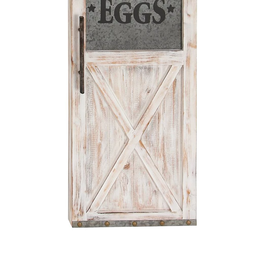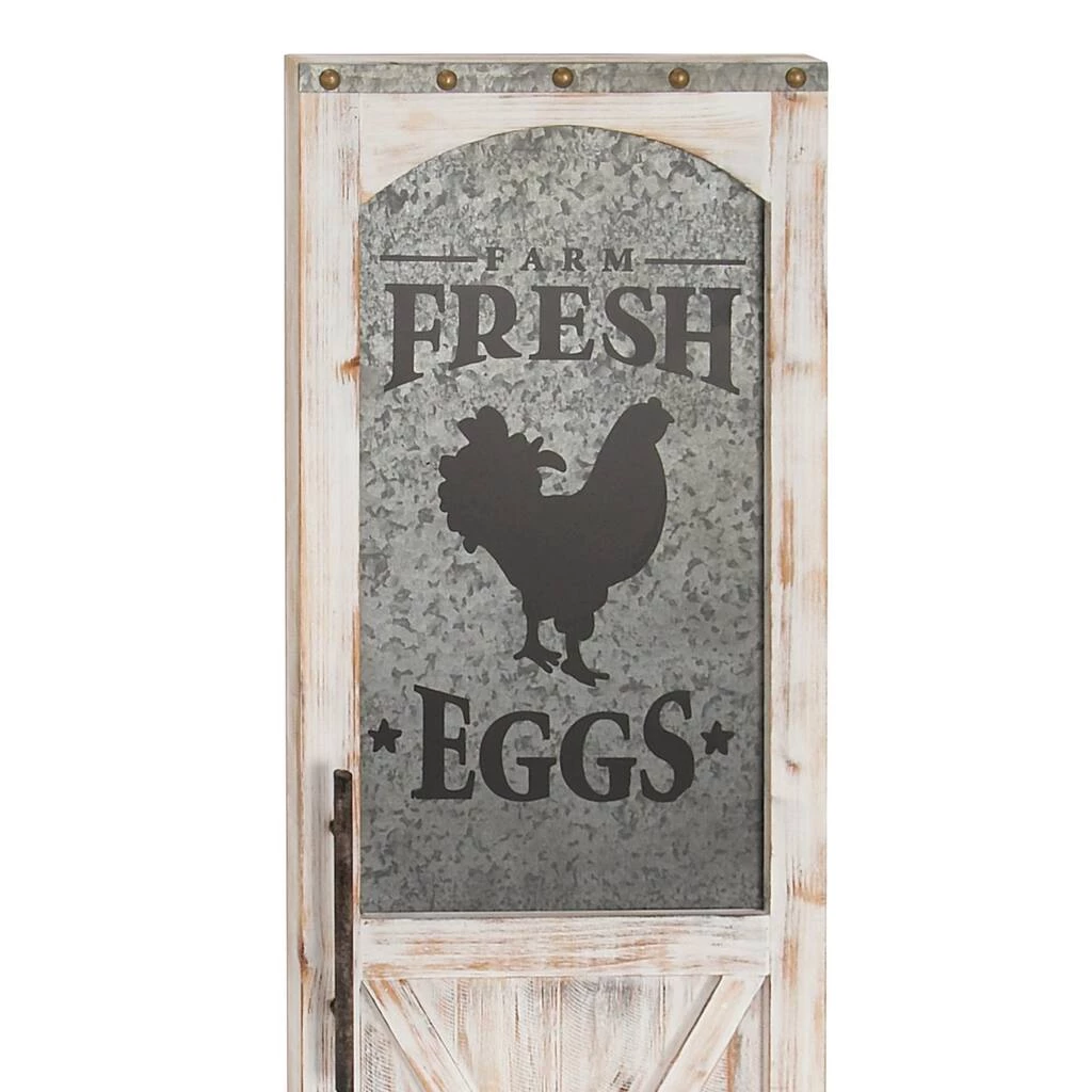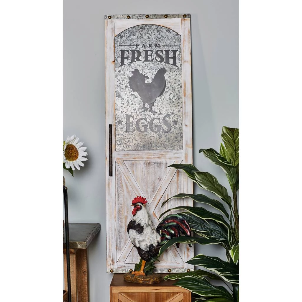 Kick your country or farmhouse style kitchen up a notch with this 47″ Black Wood Farm Fresh Eggs Wall Decor, featuring metallic silver galvanized metal with “FARM FRESH EGGS” script and a chicken illustration. The metal sign is housed in a whitewashed wood frame with a re-purposed barn door look, included studs and a distressed metal handle.