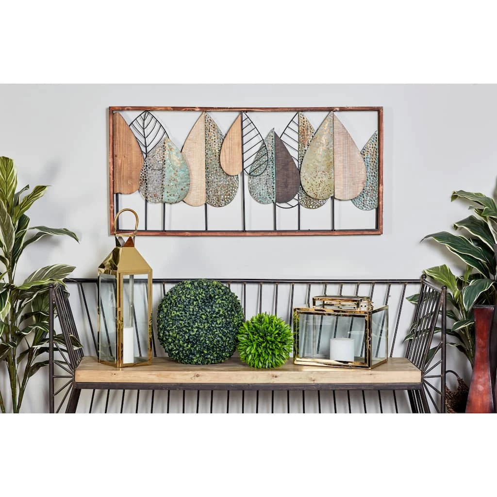 Textural, layered leaf sculptures are crafted from Chinese fir wood and iron to create this rectangular framed wall decor panel. Various muted earthy tones and shapes bring the modern art leaves to life, including tones of beige, gold, aqua, and grayish-green with crosshatching, pierced metal, natural wood grain, and distressed metal finishes.