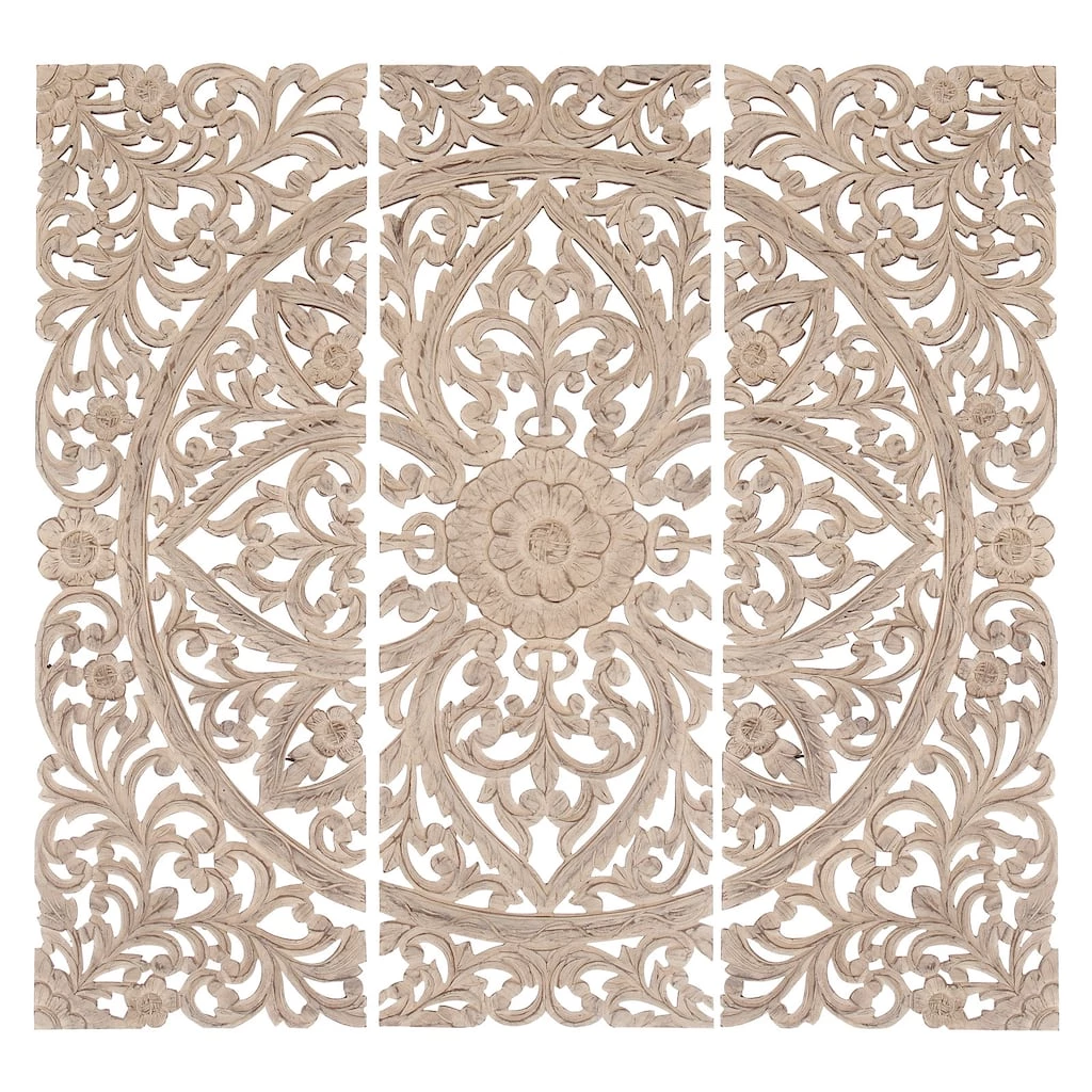 Crafted in India, these extra-large, breathtaking wood wall décor panels are comprised of 3 long wood panels, each with hand-carved floral and acanthus designs with a distressed eggshell white finish. The intricate carvings have dimensional details within each petal, leaf, and stem, but when hung next to each other, the three carved wall panels form a large flower encompassed by a circle, creating a dramatic natural and traditional décor piece. The finish is a distressed eggshell white paint over the MDF, adding a bright touch to your space. This set includes 3 panels. This item comes shipped in one carton.