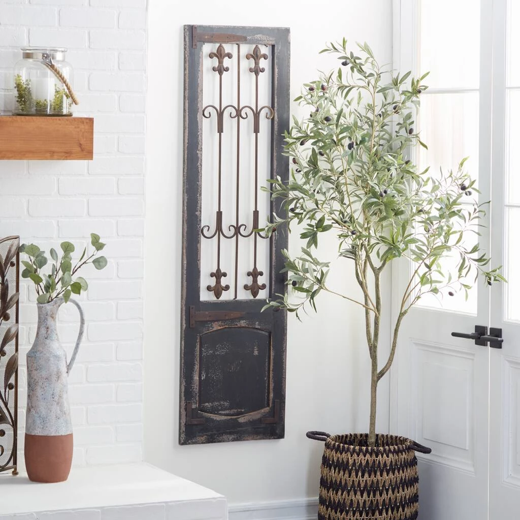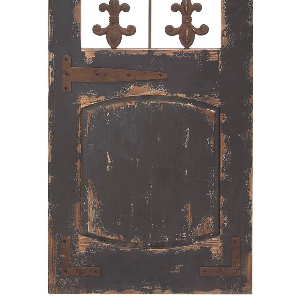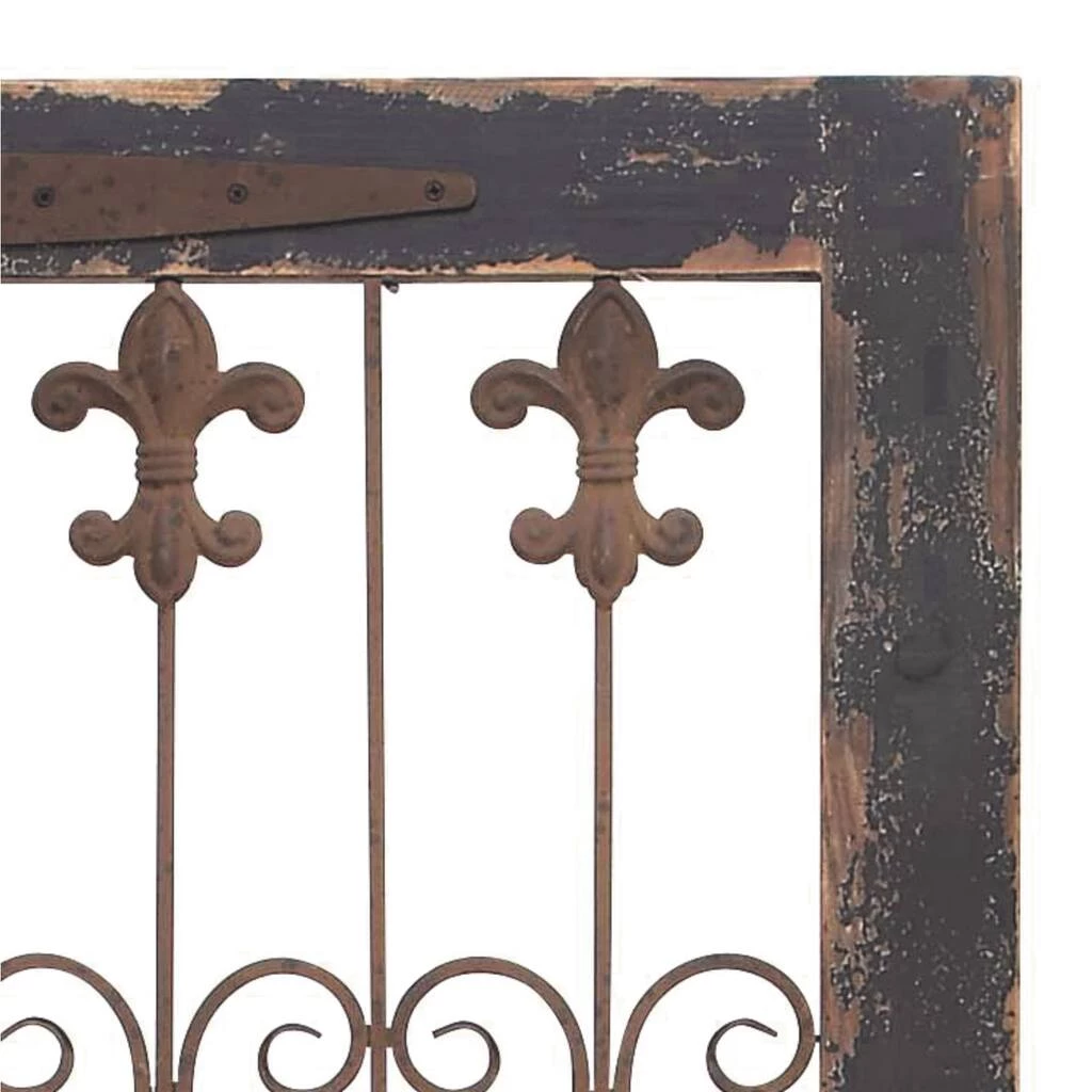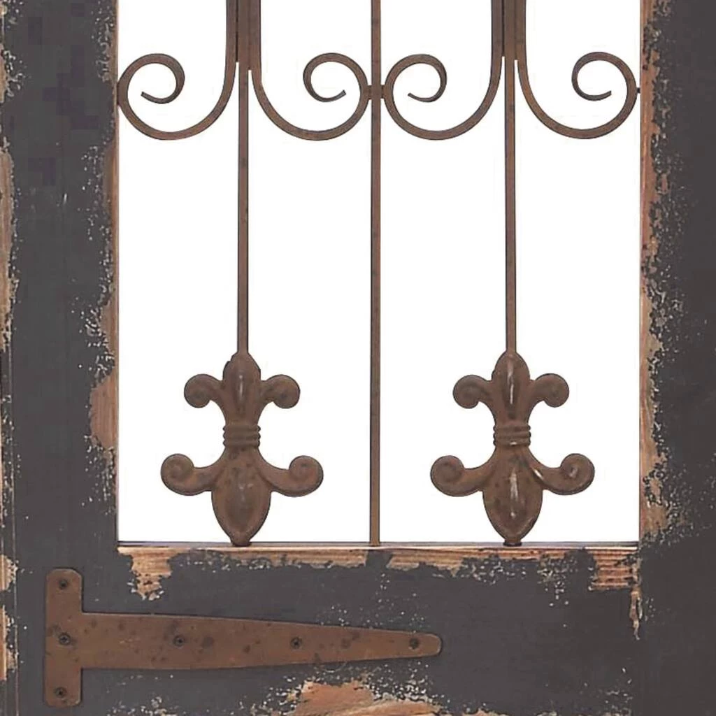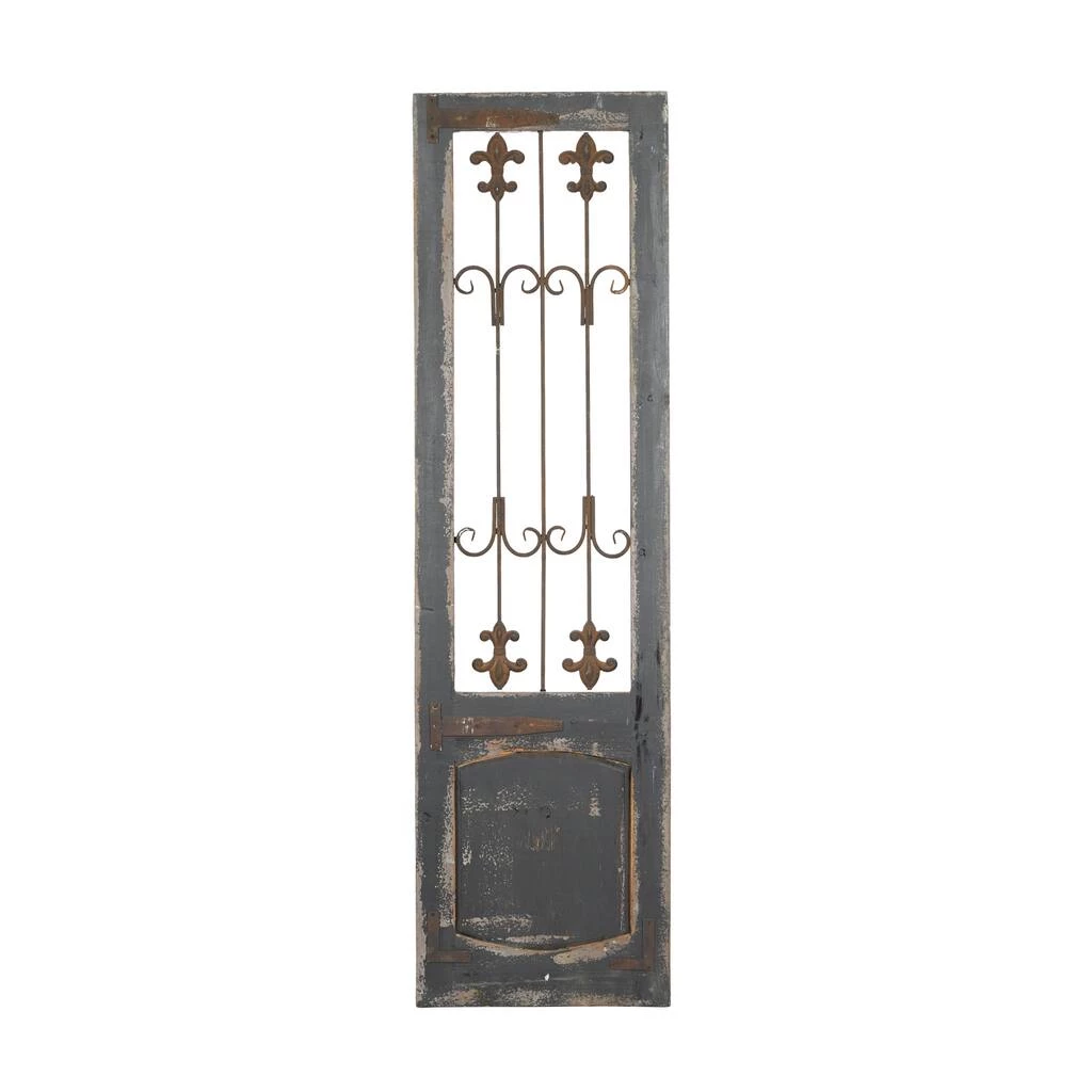 Add an elegant and antique touch to your entryway, living room, or foyer with this distressed wooden garden gate wall dΓ©cor, featuring fleur de lis metal scroll work. This ornamental door makes a great accent on a blank wall surrounded by floor plants.