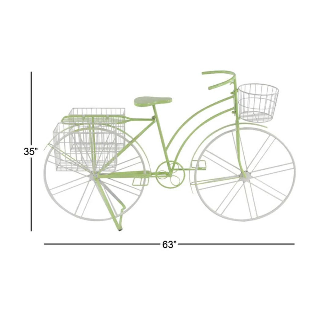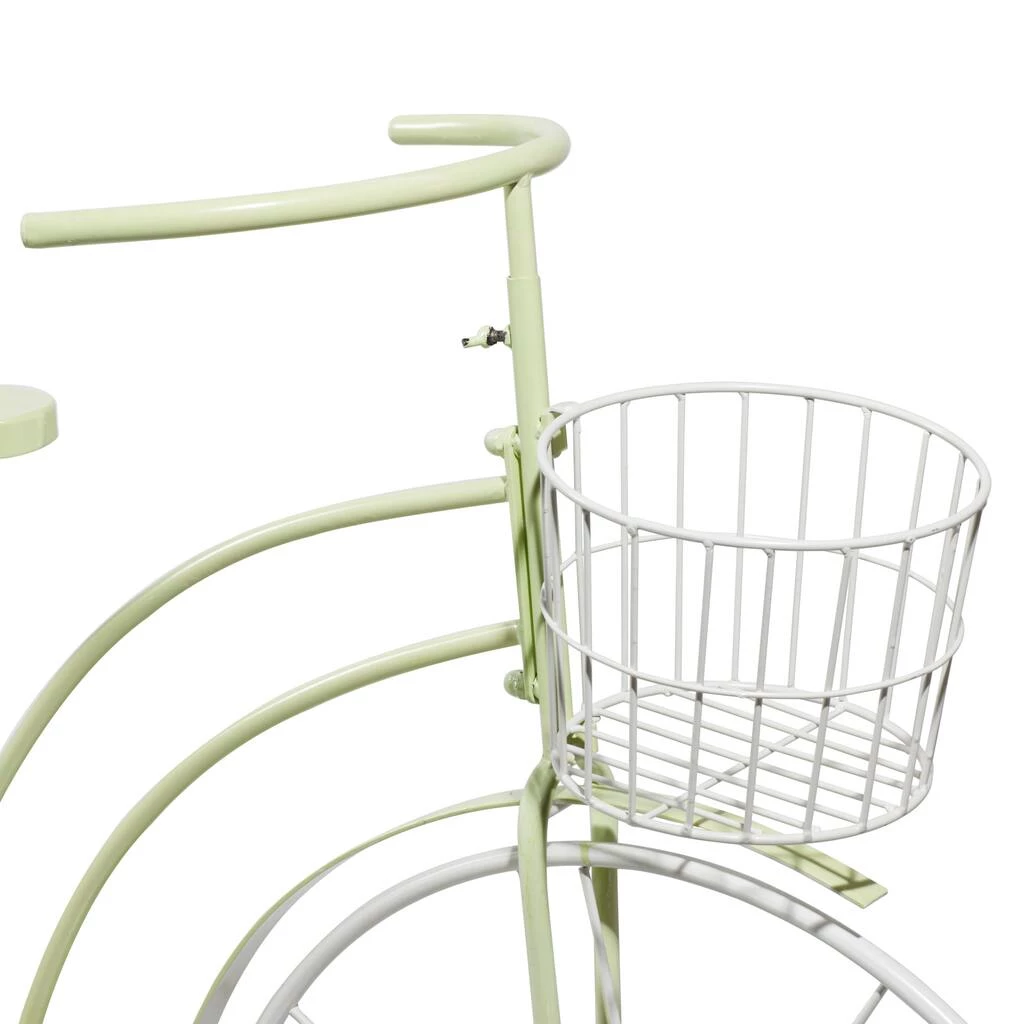 This colorful and stylish planter rack is safe in any weather. It combines the colors pastel green and white and a neighborhood bike silhouette to create a vintage-inspired look. The sturdy and slender frame is constructed from solid tin. It features realistic bicycle parts, including wheels, pedals, baskets, and seats. It also has 6 planter racks total: 3 baskets and 3 small platforms. Use it to display botanicals on the porch, patio, or greenhouse garden. This fun and nifty garden plantstand can also be creatively used as a display or to hold your beautifully potted plants. This item ships in one carton. Maximum weight limit is 5 lb. per shelf.