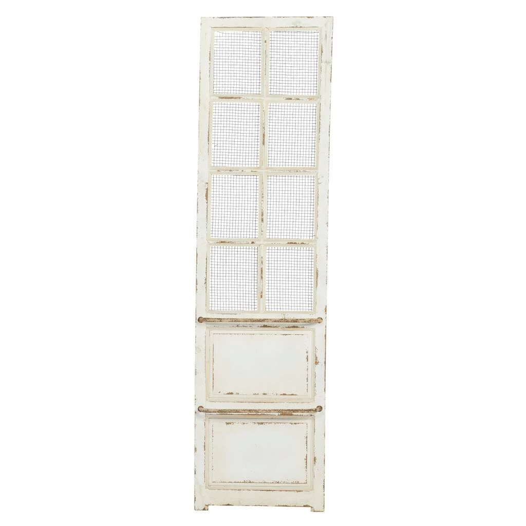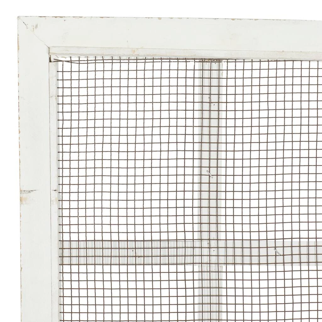 Accessorize your living space with wall dΓ©cor with a farmhouse style. This door style wood and metal panel features a rectangular wooden frame in a distressed cream finish, iron mesh grid divisions at the top part, and hanging bars at the bottom part. The latter can be used to hang dish towels or decorative hanging trinkets.