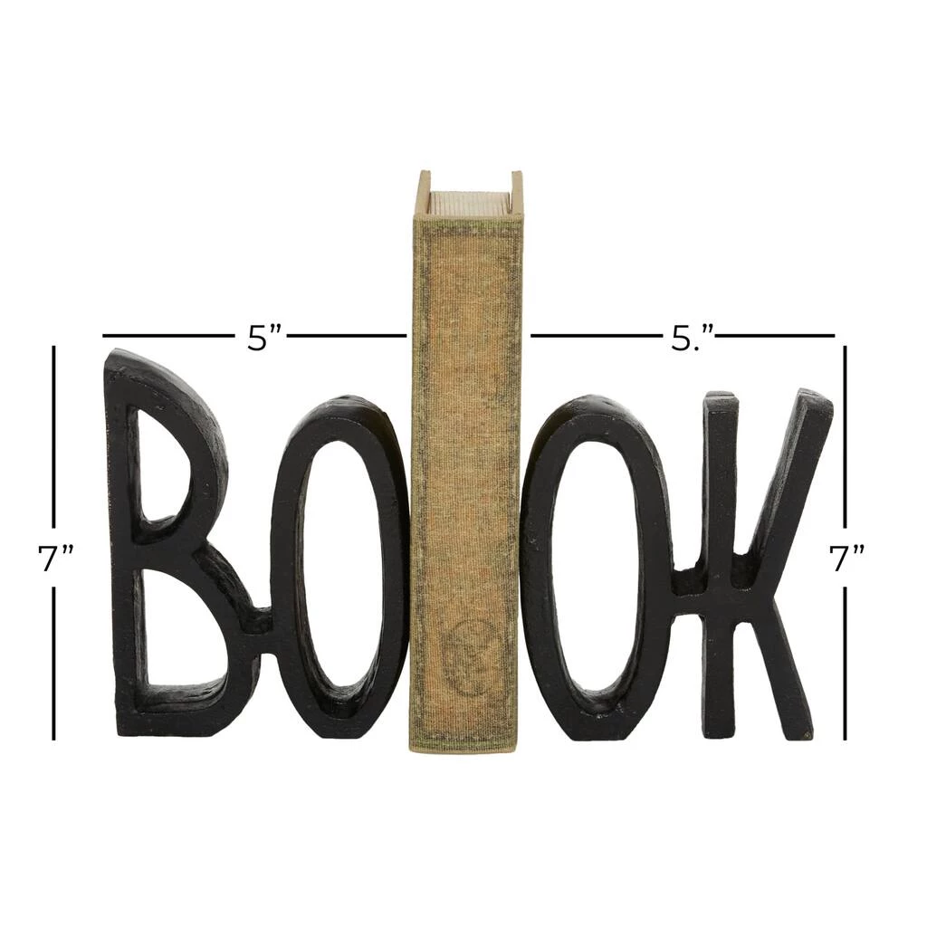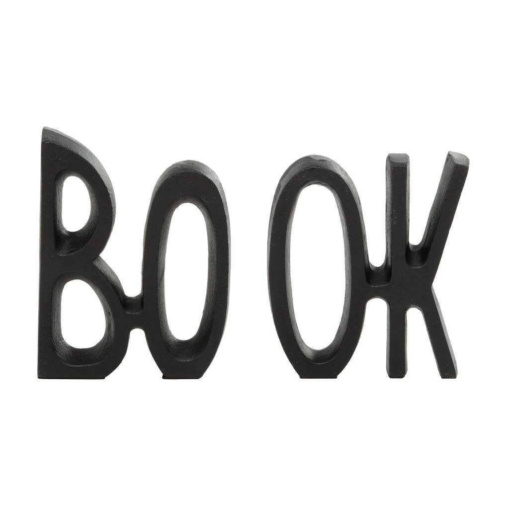 Replace your old, outdated bookends with this set of black “BOOK” sculptured metal bookends! The two pieces together form all caps “BOOK” spelled out in a long, narrow font with slightly raised ends for a modestly curved silhouette along the top. The matte black finish suits modern and contemporary spaces, while also working with any color palette in any style room. The dimpled texture of the aluminum adds some stylish character, as well.