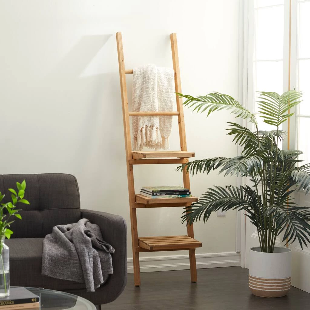 This light brown wood leaning ladder shelf is a perfect addition to your entryway, living room, or bedroom. A decorative ladder that features a rustic charm with a light brown finish, making it great for homes with country and farmhouse interiors. This 3-shelf wooden ladder is not only attractive, but can also function as a storage for books, picture frames and other decorative pieces. You can also be creative by accessorizing them using decorative lights. Spice up your home with something out of the ordinary with this amazing ladder shelf.